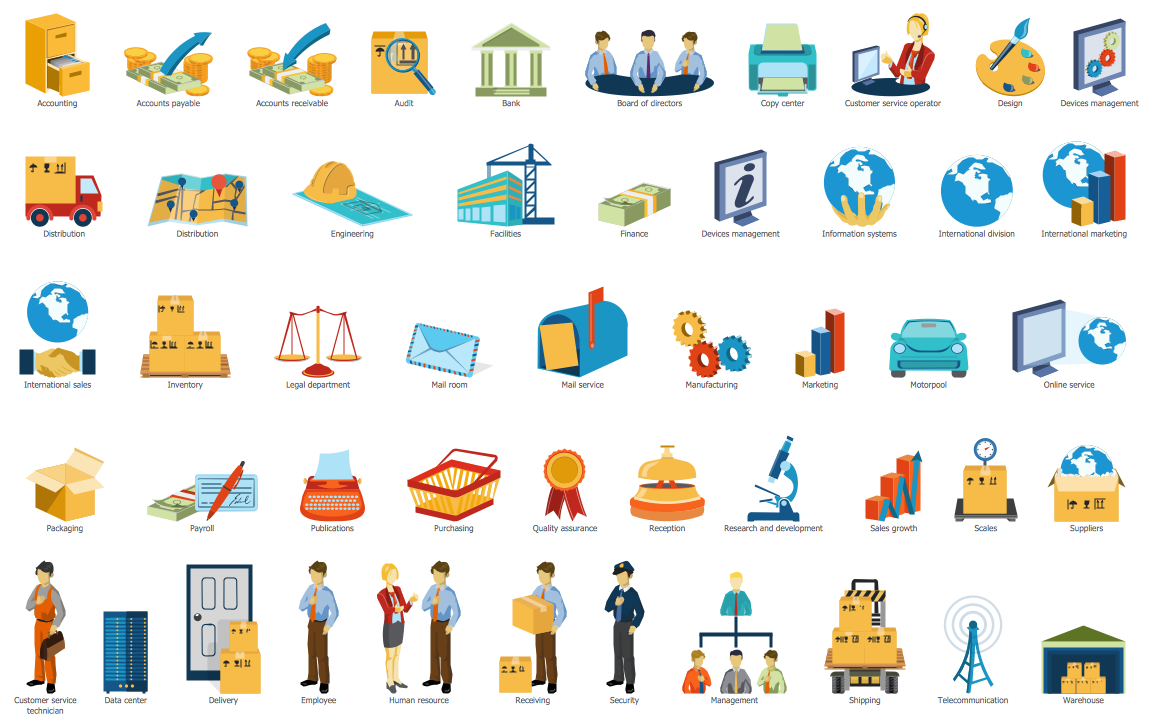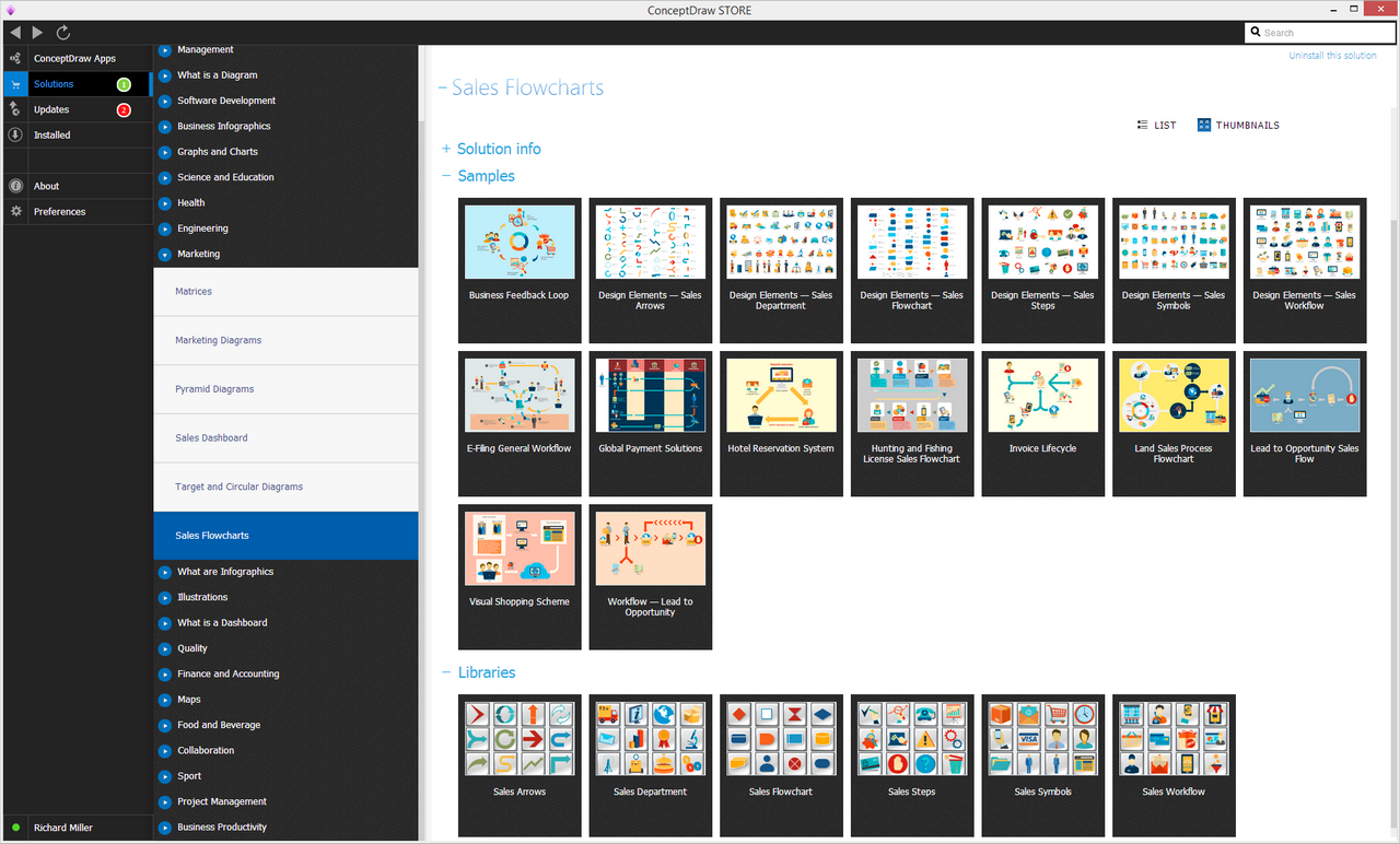The Sales Flowcharts solution contains 10 examples and 6 libraries containing 285 vector graphics and objects.