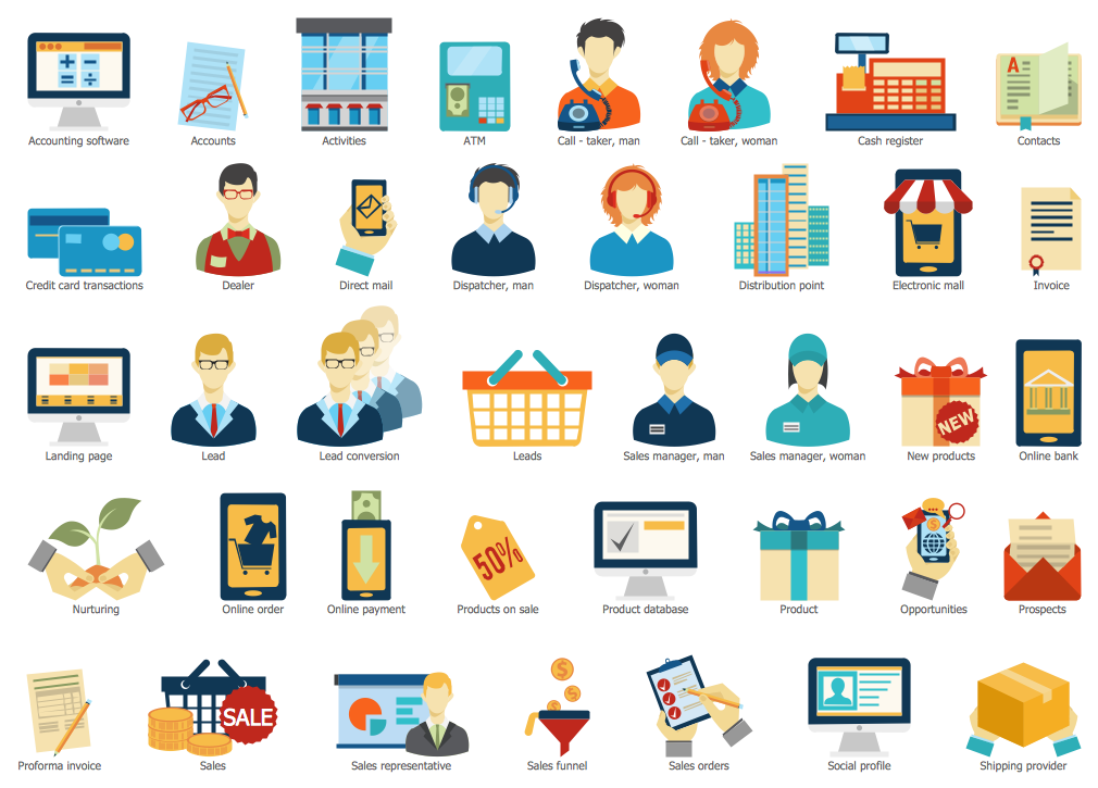 The Sales Flowcharts solution can be used while creating the sales and marketing-related drawings in the ConceptDraw DIAGRAM diagramming and drawing software. It provides all the ConceptDraw DIAGRAM users with a colourful as well as a comprehensive selection of sales themed symbols, flowchart icons and graphics allowing creating both informative and vivid sales process maps and workflow diagrams.