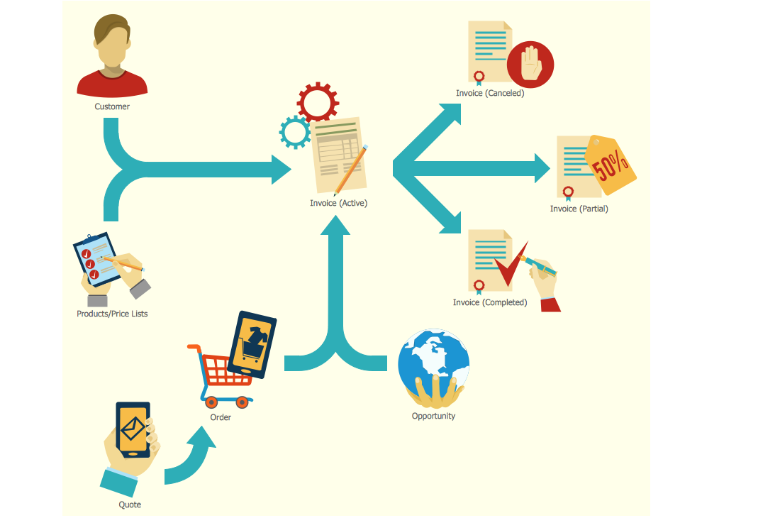 This Sales flowchart example shows the lifecycle of an invoice in Microsoft Dynamics CRM. Having as the base the Wikimedia Commons file "Invoice lifecycle.svg", this sample was designed only by use of ConceptDraw DIAGRAM drawing tools. The Microsoft Dynamics CRM developed by Microsoft Corporation is a special server-client software package with extensive web services interfaces, directed on the customer relationship management and focused also on the sales, marketing and services. When making your diagrams and flowcharts pay special attention to design, style and color gamma, because the text information supplemented by visual figures is perceived easier and faster by the audience, and not only marketing, business, or management-related, but also any other audience. In particular, the ConceptDraw's Sales Flowcharts solution from the Marketing area of ConceptDraw Solution Park is quite effective in a field of marketing and sales, and correctly applied is powerful in enhancement sales volume in short terms.
