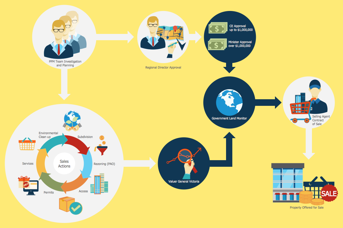 This sample represents the flowchart of the land sales process in state of Victoria, Australia. It is based on the illustrations from the Property management webpage of VicRoads (Roads Corporation of Victoria) website. There are represented all stages that need to be proceed before the property will be offered for sale. The combination of different visual forms is an excellent support in a process of designing diagrams, and it is coming not only about clipart, pictures, icons, symbols, but also about the use of additional charts and graphics within a diagram that you are constructing now. Thus, on this flowchart in addition to bright and colorful clipart, you can observe a Cycle diagram of the sales actions. Position consistently the steps of your flow and maintain the distance between them, do not saving the space. Remember that the clarity and accuracy are key to success in construction the Sales flowcharts.