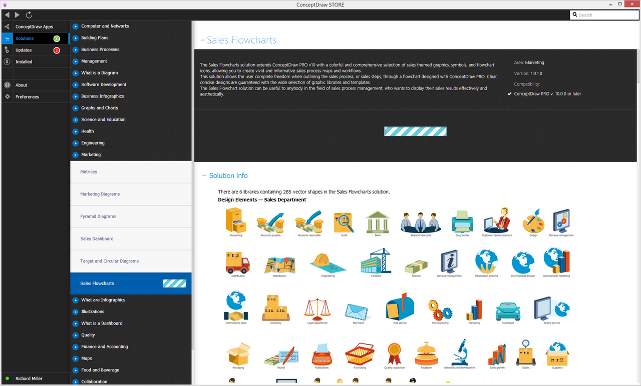 After ConceptDraw STORE and ConceptDraw DIAGRAM are downloaded and installed, you can install the Sales Flowcharts solution from the ConceptDraw STORE.