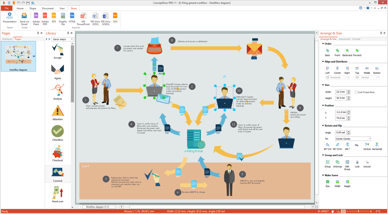This Sales workflow diagram example has as the base the "Online submission" illustration offered on the e-Filing Portal of the Malaysian Judiciary. The e-Filing Portal was intended as a one-stop portal for the legal community and is used successfully for gaining the access to all set of required functions - from the registration of cases in the e-Filing System to the quick filing of case documents, and search of needed information and service documents. This portal provides also convenient feedback with lawyers allowing them to be notified about the status of their cases directly by email. A slightly more complex diagram in contrast to the previous examples is represented here, that uses a combination of text and graphics to strictly convey the inputs and outputs of a court filing system. ConceptDraw DIAGRAM software allows you to create coherent and clear Sales Process Flowcharts that are rich in information and data.