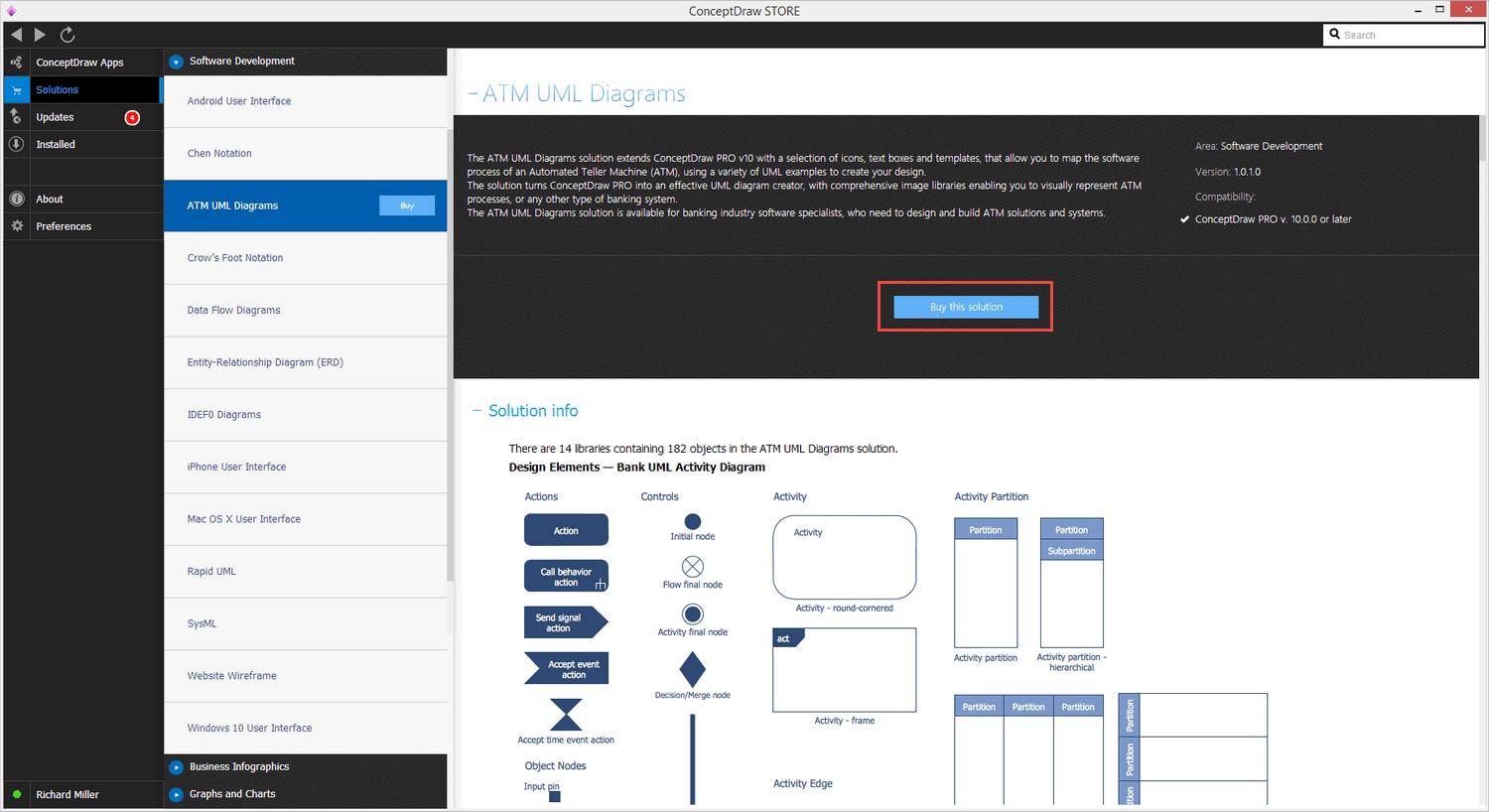 After ConceptDraw DIAGRAM is installed, the ATM UML Diagrams solution can be purchased either from the Software Development area of ConceptDraw STORE itself or from our online store. Thus, you will be able to use the ATM UML Diagrams solution straight after.