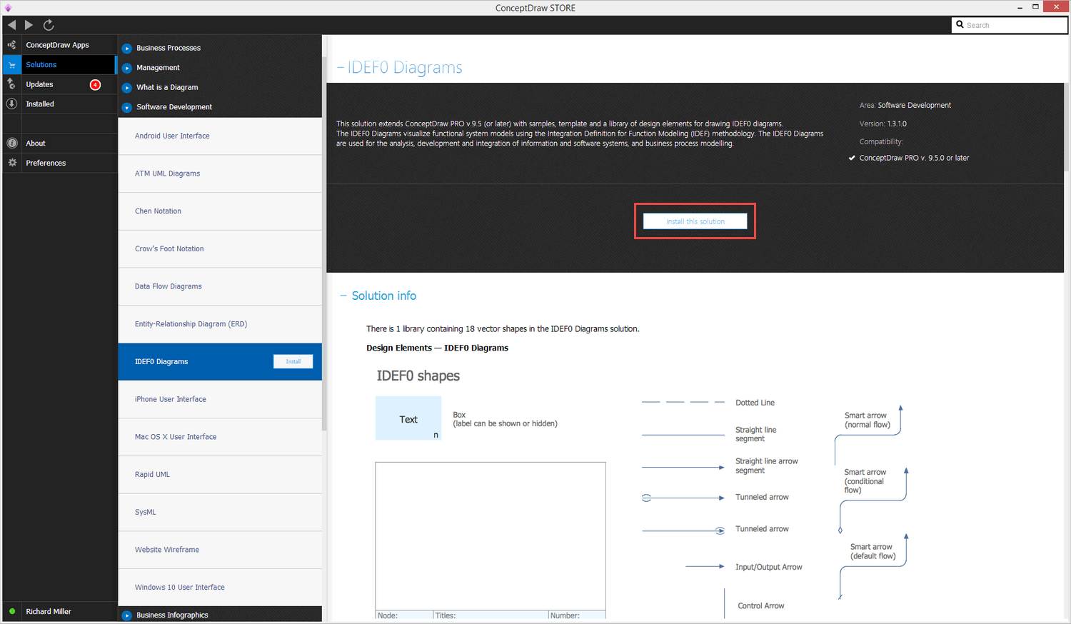 After ConceptDraw STORE and ConceptDraw DIAGRAM are downloaded and installed, you can install the IDEF0 Diagrams solution from the ConceptDraw STORE.