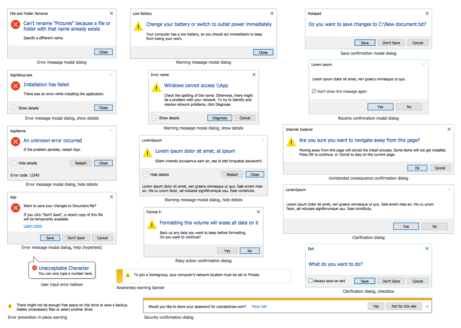 There are a few samples that you see on this page which were created in the ConceptDraw DIAGRAM application by using the Windows 10 User Interface solution. Some of the solution's capabilities as well as the professional results which you can achieve are all demonstrated here on this page.