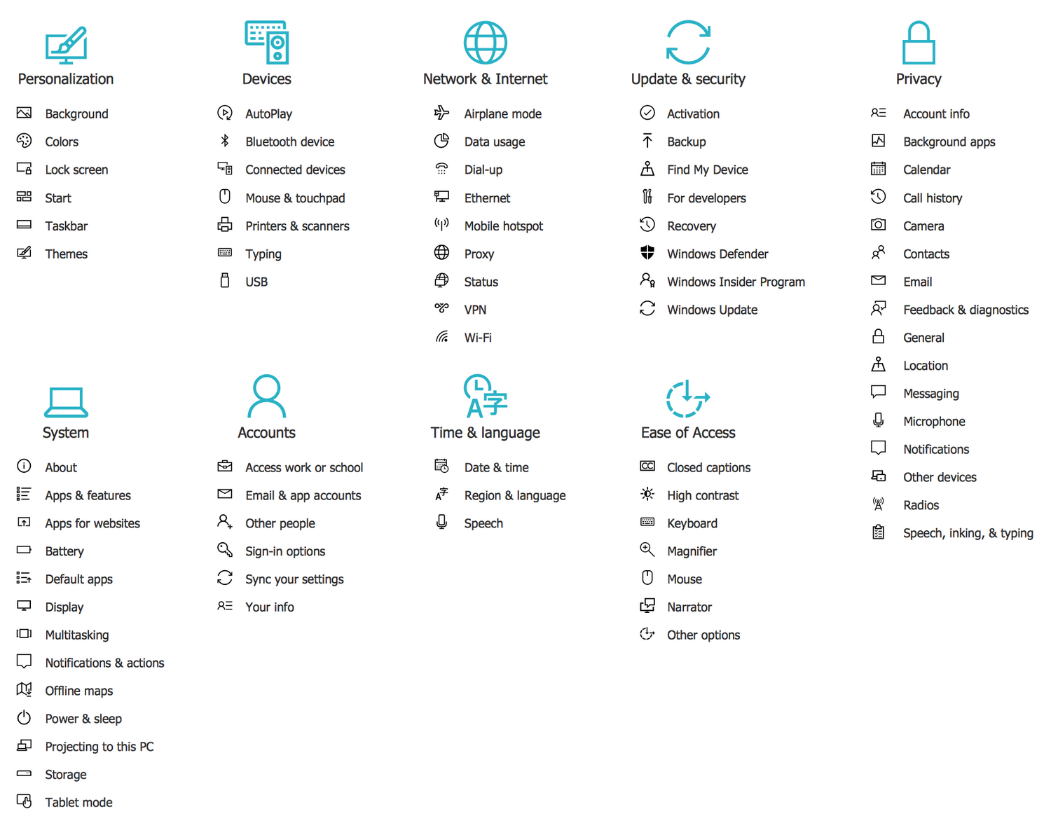 This example shows the Windows 10 Settings app. This panel is quickly opened from the Start menu in Windows 10 operating system and lets you control the system settings of your PC, to view the information about printers and other devices settings, to make the changes in time, date, language and other personalization settings, to configure accounts, privacy, security, network settings, etc.