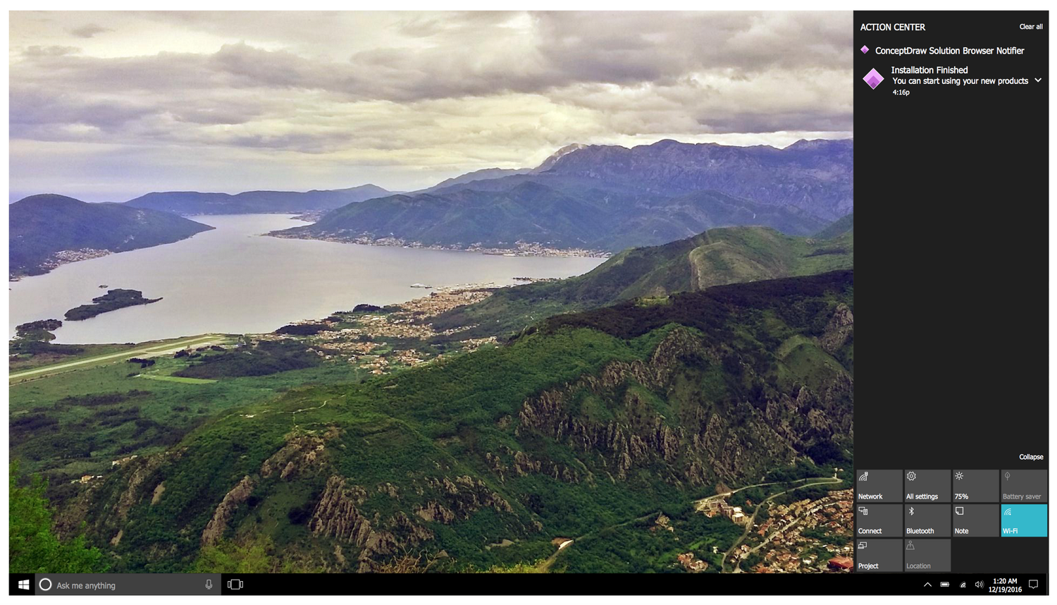 This example shows the Action Center, which is a useful feature of Windows 10. It gives for its users the access to the list of all notifications from the applications that were missed for whatever reasons, no matter these applications are run at this moment or not. The notifications are grouped by applications and time, and can be closed one by one or all together using the Clear All button.