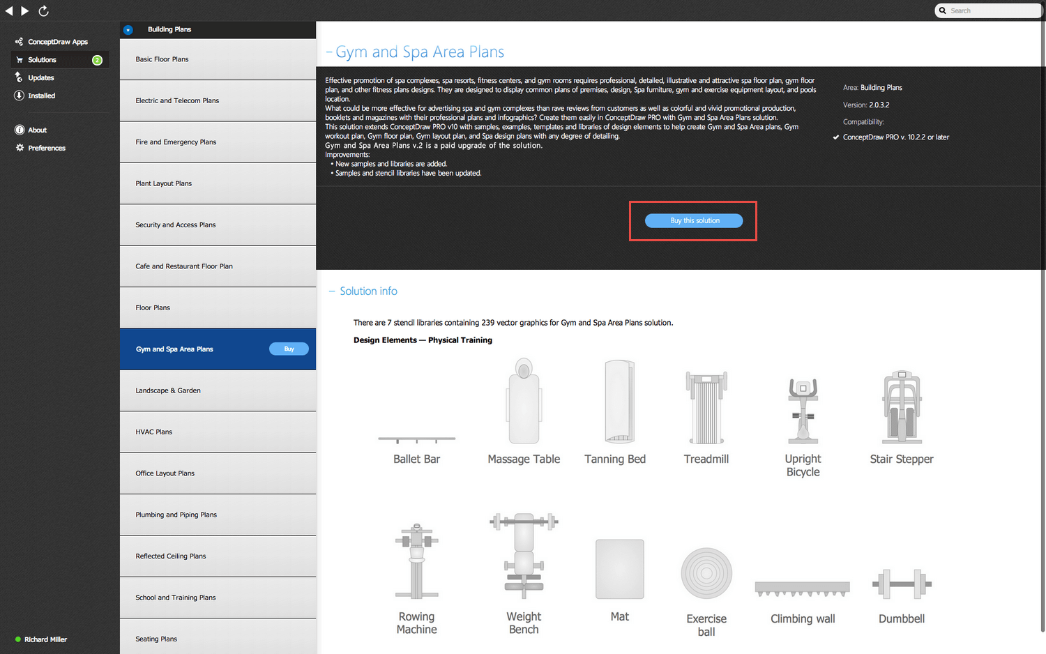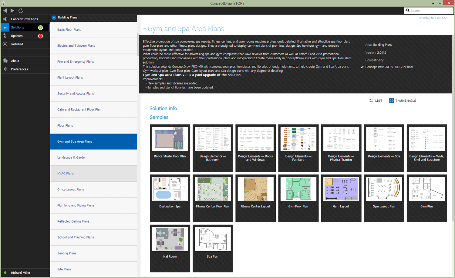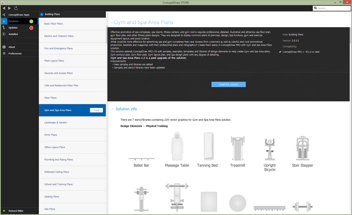 After ConceptDraw DIAGRAM is installed, the Gym and Spa Area Plans solution can be purchased either from the Building Plans area of ConceptDraw STORE itself or from our online store. Thus, you will be able to use the Gym and Spa Area Plans solution straight after.