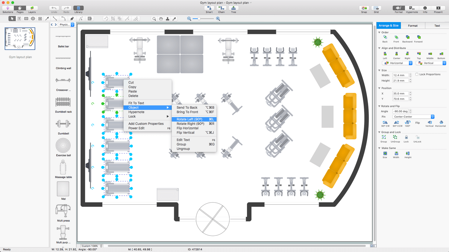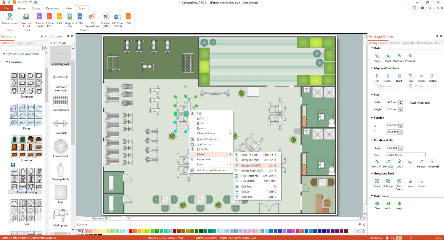 This sample shows a Fitness club’s floor plan. You can observe several rooms: training room, shower room, WC, dressing room, hall with reception, and two rooms where the clients can get the extra services — the massage room and solarium. The training room occupies the greatest part of the space that is natural for the gym club. A large number of diverse exercise equipment can increase the effectiveness of the physical training. Ahead of time, arrange them in the plan and then in a real room by groups, according to the ease of use and the recommended sequence of performing exercises. Some equipment can be configured with additional items, such as proper footgear, gloves, hydration system, etc. ConceptDraw DIAGRAM software contains a large number of predesigned objects. That's why it’s very easy, convenient and quick to create the professional looking Gym Floor Plans of any size or detail with ConceptDraw DIAGRAM.