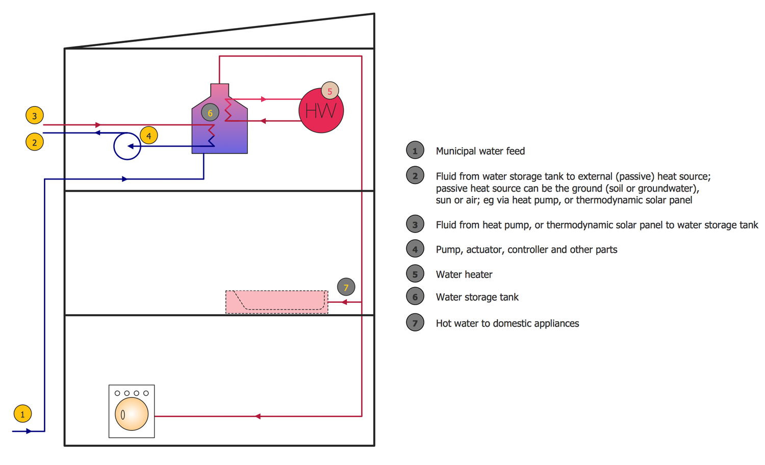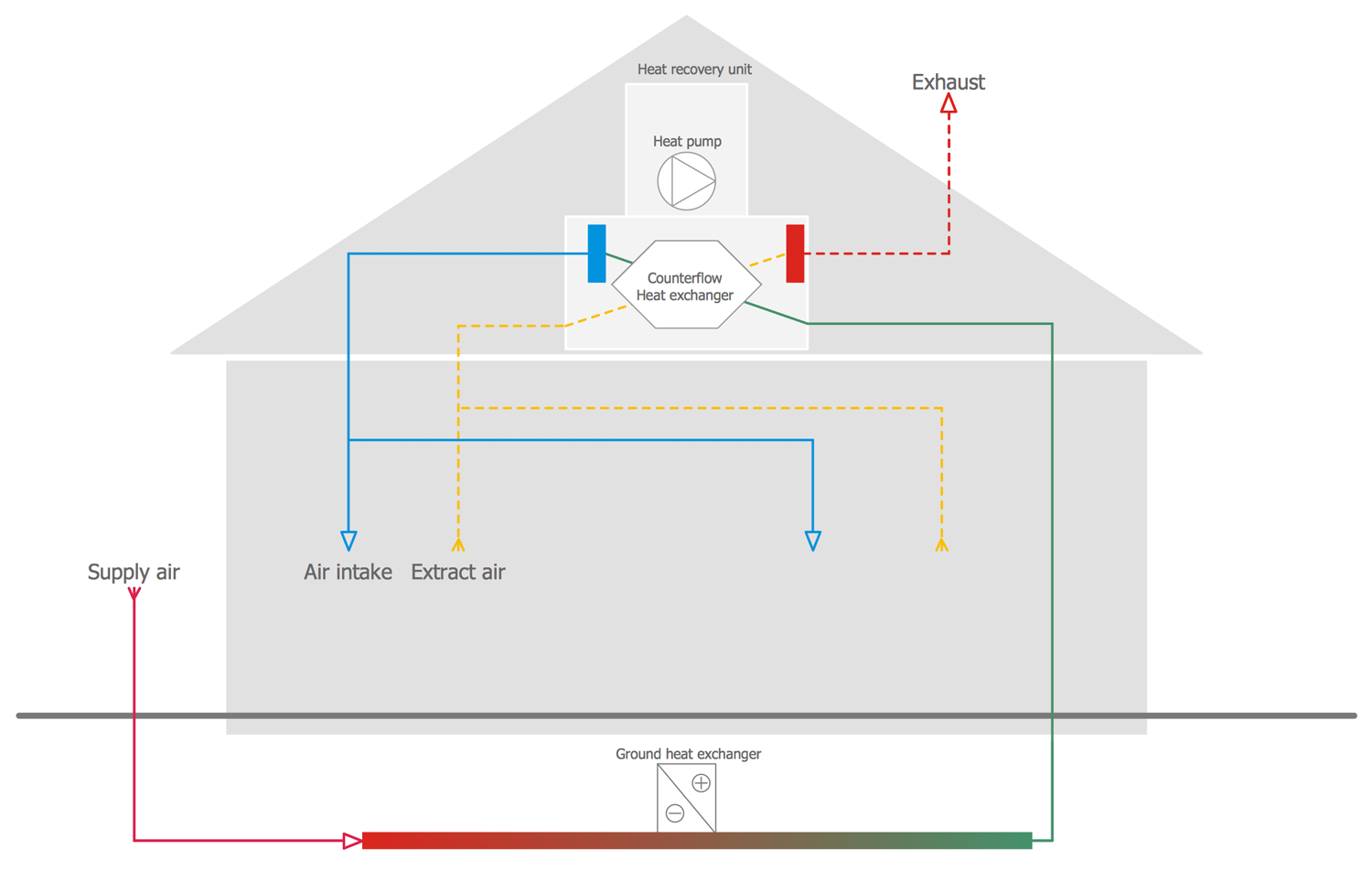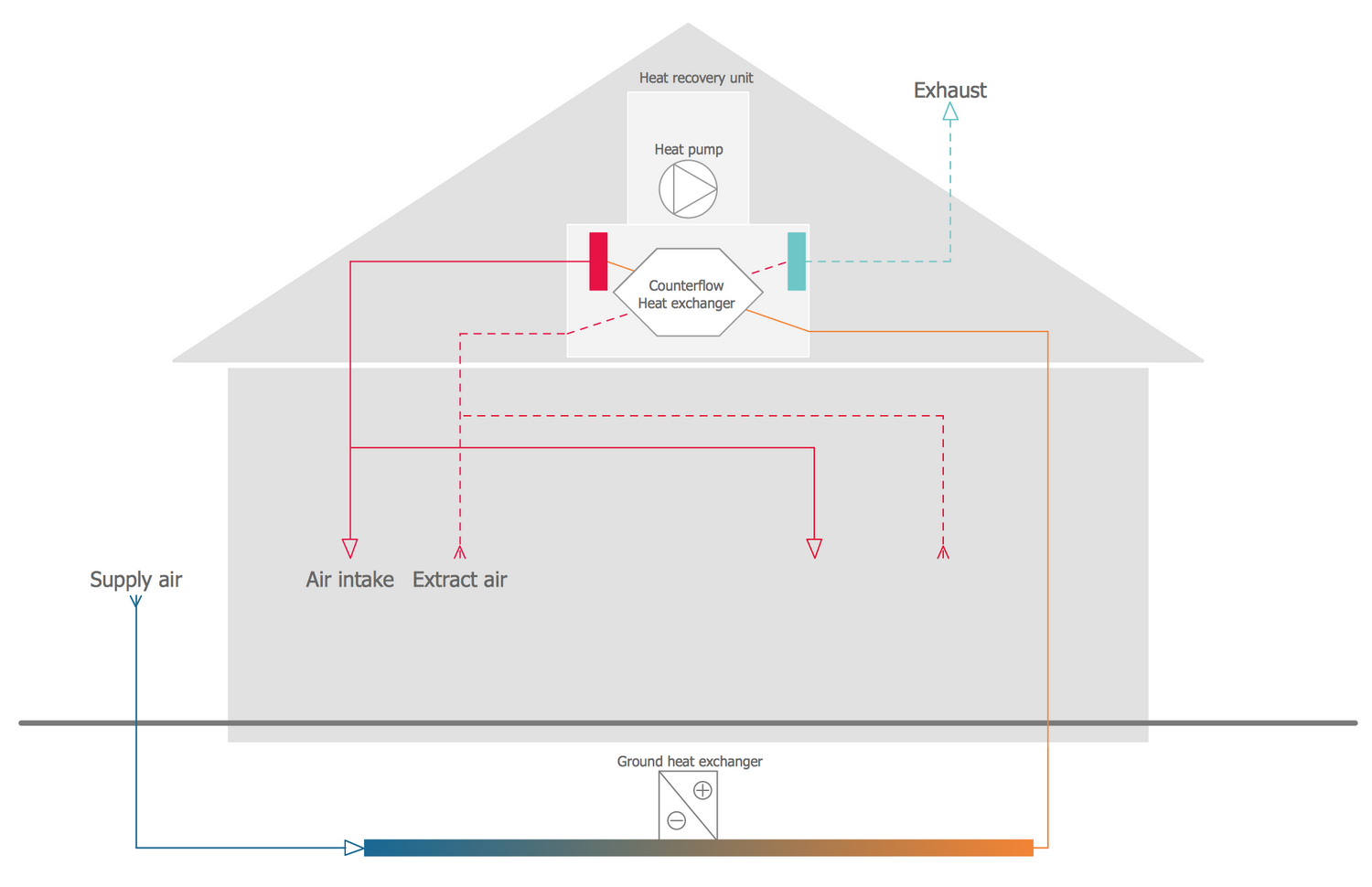 This sample demonstrates a detailed plan of a Ventilation Unit with a Heat Pump and Ground Heat Exchanger, its placement within a house, schematic of internal arrangement and mechanism of work. This sample is based on the similarly named file from the Wikimedia Commons, but now it is constructed through the use of ConceptDraw’s HVAC Plans Solution. The heat recovery ventilation is an energy recovery ventilation system, which provides fresh air and improved climate control, and consists of several components depicted on this diagram, such as the Heat recovery unit, Heat pump, Counter-flow Heat exchanger and Ground heat exchanger. The air intake and extract air, supply air and exhaust are also designated on the diagram. Take into account that the use of colors and lines of varied styles can help differ and highlight various details in your plan, including the HVAC plan. The use of images, symbols and clipart is also helpful.