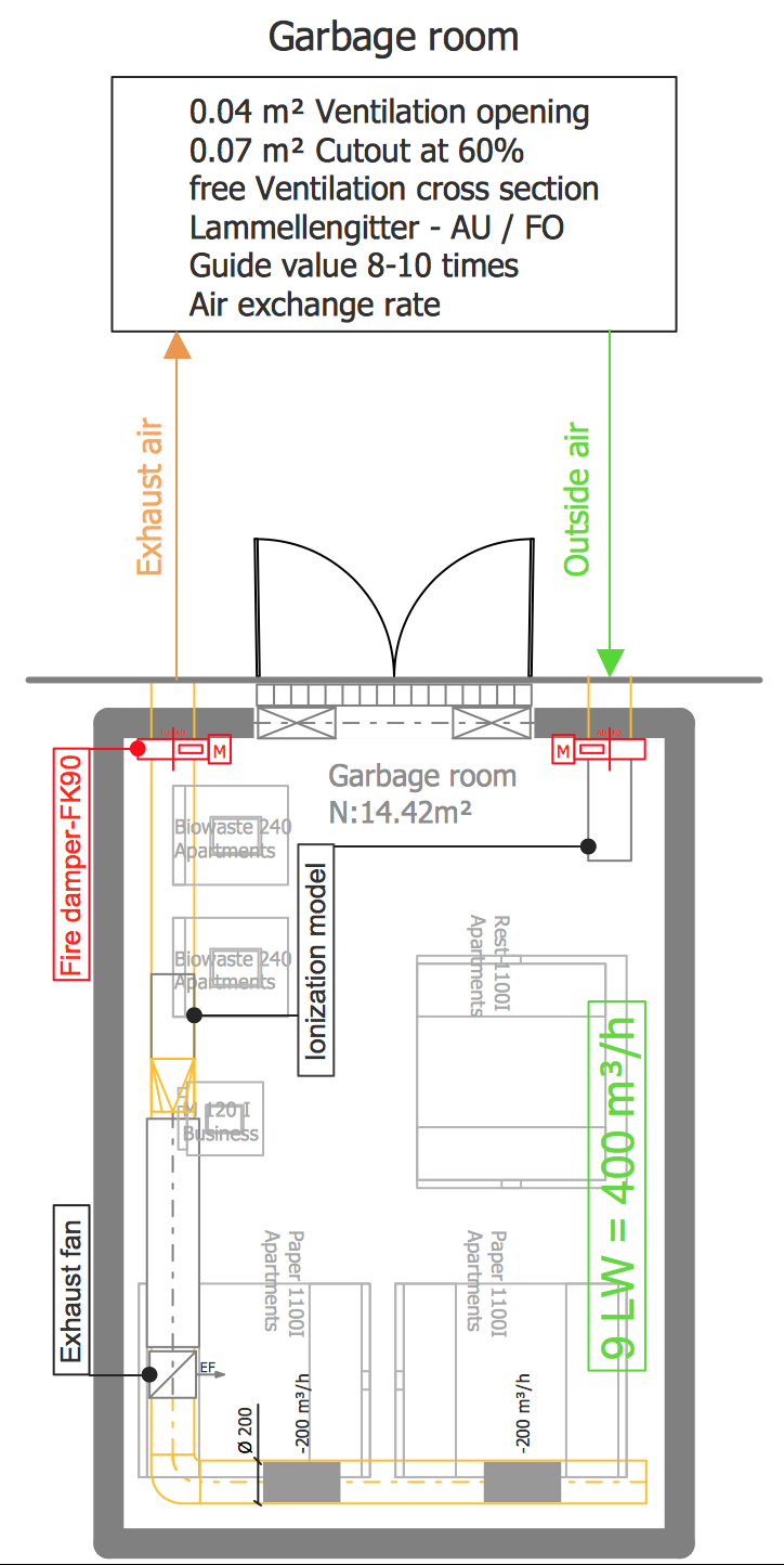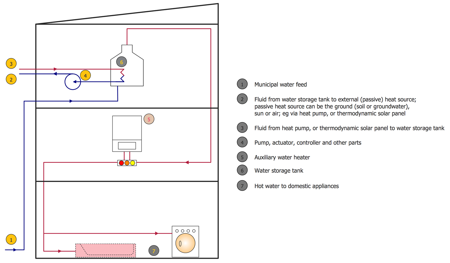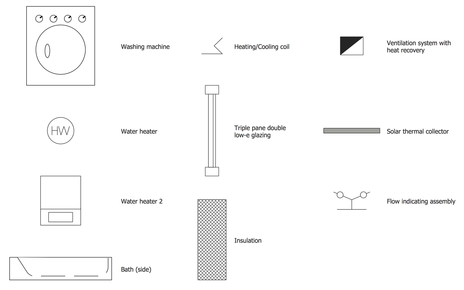 This sample demonstrates a detailed plan of a Ventilation Unit with a Heat Pump and Ground Heat Exchanger, its placement within a house, schematic of internal arrangement and mechanism of work. This sample is based on the similarly named file from the Wikimedia Commons, but now it is constructed through the use of ConceptDraw’s HVAC Plans Solution. The heat recovery ventilation is an energy recovery ventilation system, which provides fresh air and improved climate control, and consists of several components depicted on this diagram, such as the Heat recovery unit, Heat pump, Counter-flow Heat exchanger and Ground heat exchanger. The air intake and extract air, supply air and exhaust are also designated on the diagram. Take into account that the use of colors and lines of varied styles can help differ and highlight various details in your plan, including the HVAC plan. The use of images, symbols and clipart is also helpful.