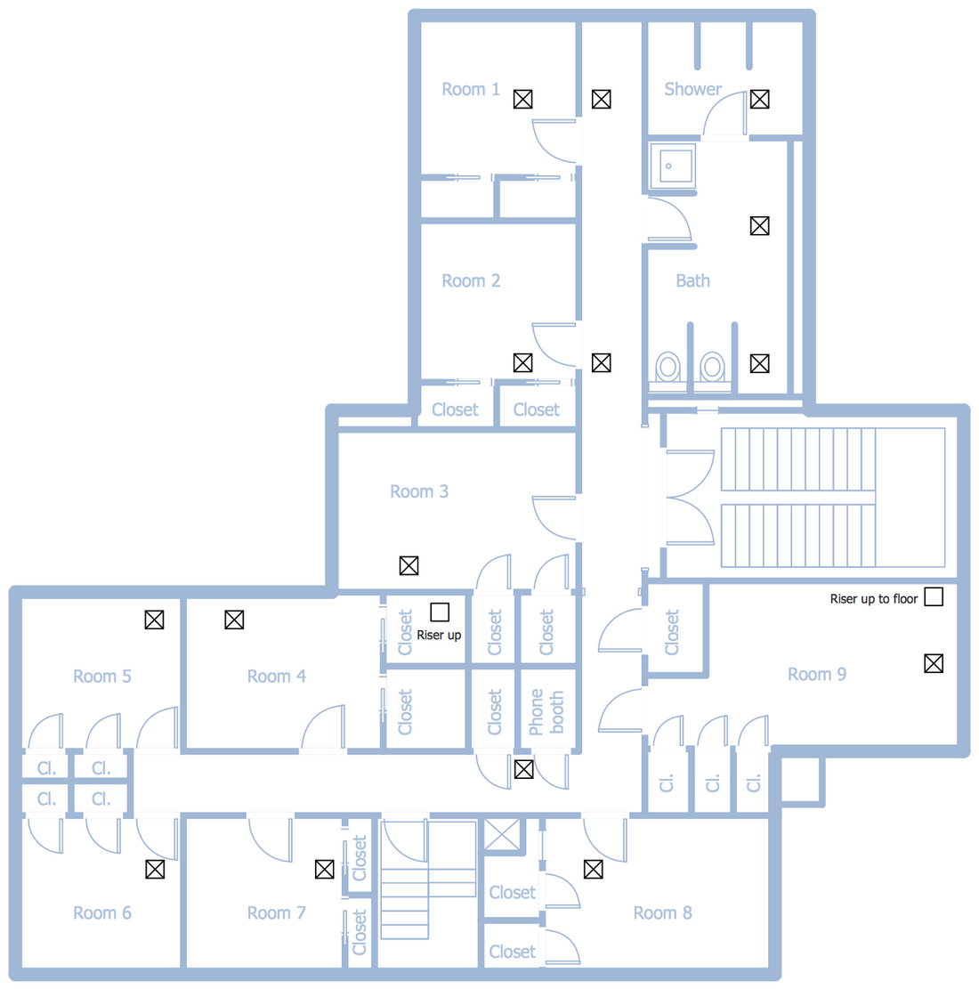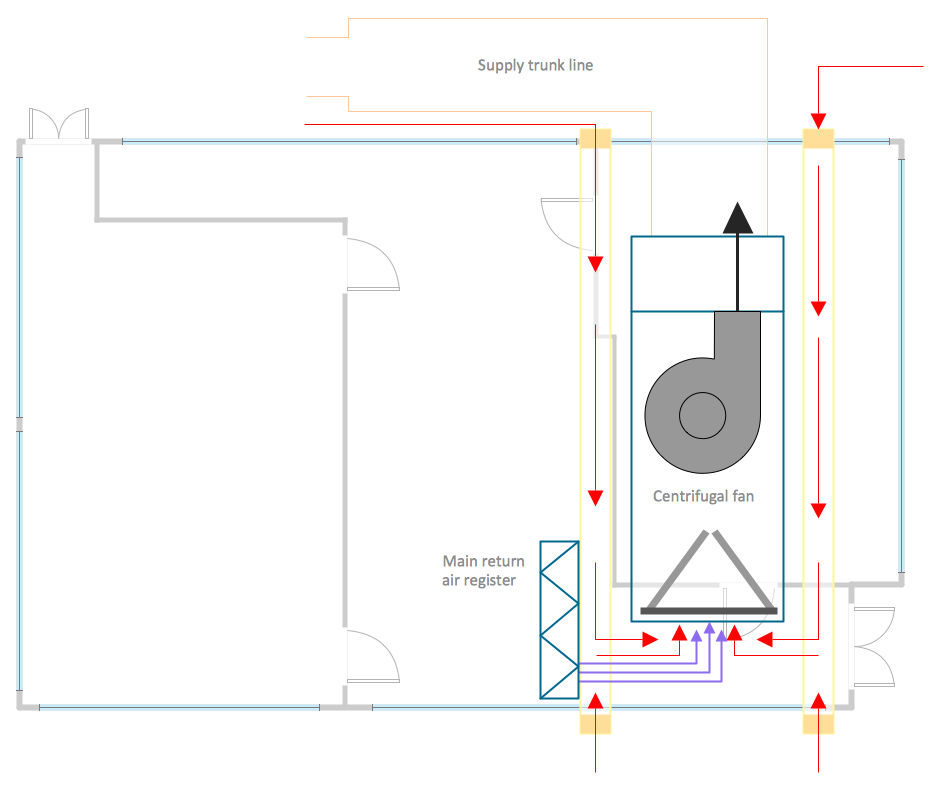 This HVAC floor plan sample illustrates the ventilation duct system layout. The ducts are ones of the basic elements in a heating, ventilation, and air conditioning system, which are used to deliver and remove the air. The ducts allow delivering the air of an acceptable quality to the room, apartment, industrial premises or any other closed space, can ensure the supply of ventilated air, and the air of required temperature or wetness mode. The planning and constructing the plan of a duct system is an important stage in building premises of different assignment. The duct design assumes the optimization, sizing, detailing, prediction and elimination of the possible pressure losses still at the stage of planning. Design easily your floor plans in the ConceptDraw DIAGRAM application using solutions from the Building Plans area and then mark on them the schemes of the ducts using the tools of the ConceptDraw's HVAC Plans Solution.
