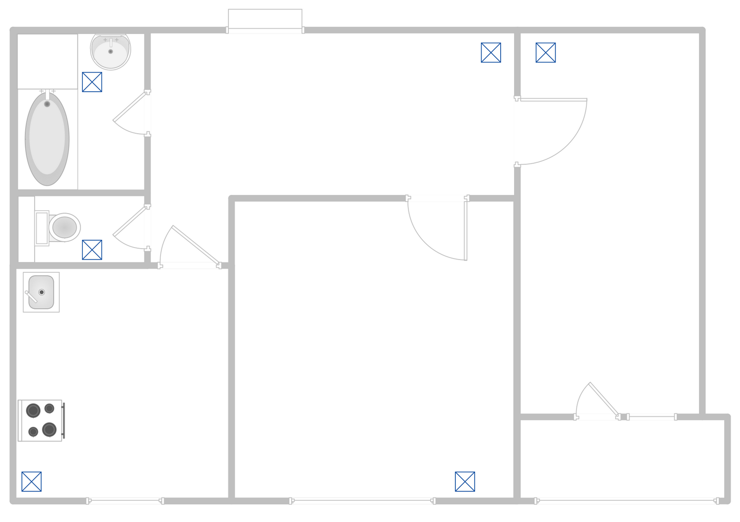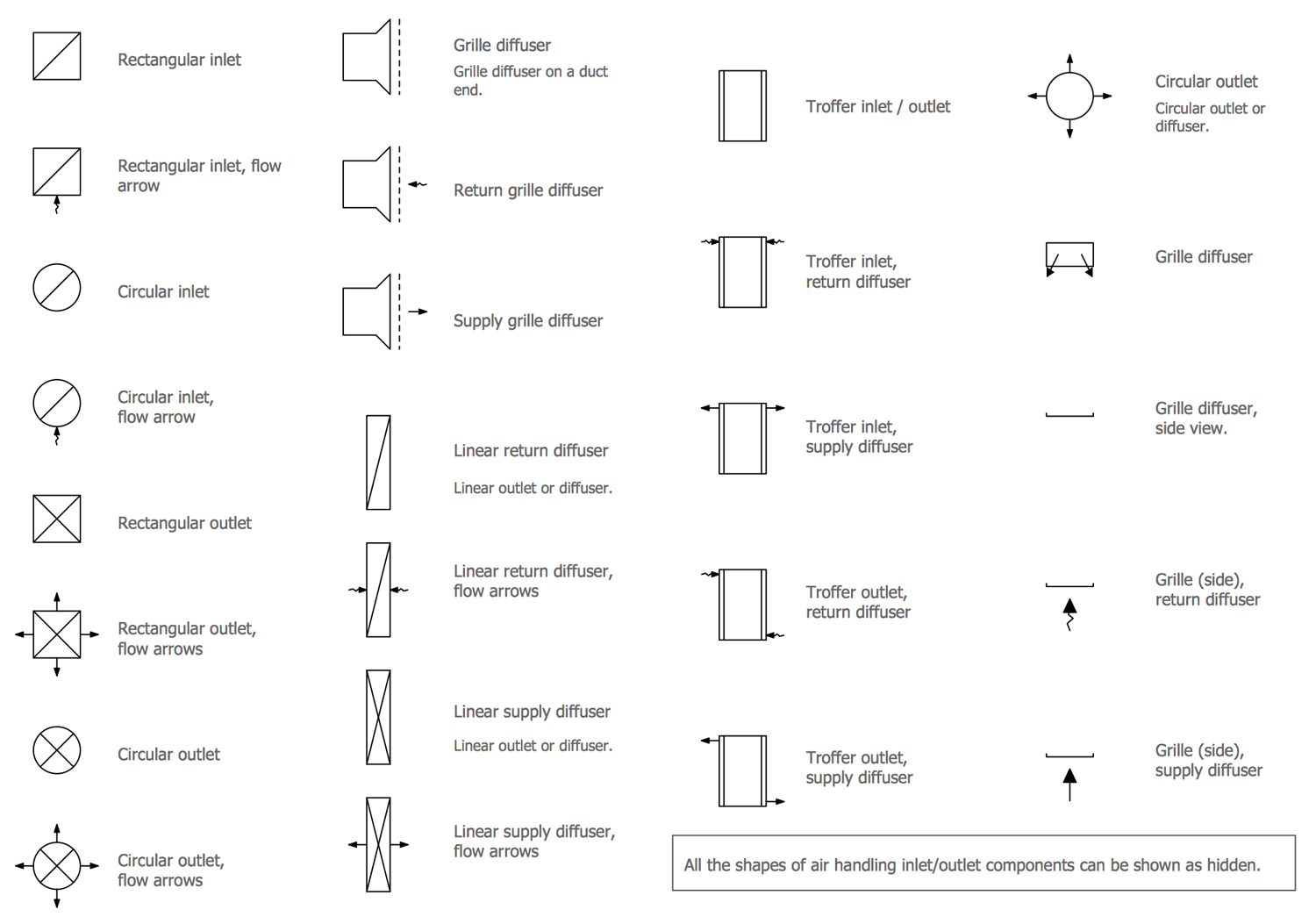 This sample demonstrates the apartment floor plan and Heating, Ventilating and Air Conditioning (HVAC) plan on it. One of the most important moments for each premise is its ventilation because it ensures the air circulation, allows maintaining the proper quality of the air, comfortable temperature and level of wetness within a closed space. It can be a mechanical ventilation or a natural ventilation, or their combination. The ventilation system within a given premise can be classified as mechanical ventilation, it is realized through the use of duct outlet diffusers, which are a special part of ventilation system intended for input and output of the air to and from the closed space, as well as for its effective mixing. The layout of exhaust ventilation duct outlet diffusers is visually represented on this diagram designed using the drawing tools of the ConceptDraw DIAGRAM software and the predesigned objects from the libraries of HVAC Plans Solution.