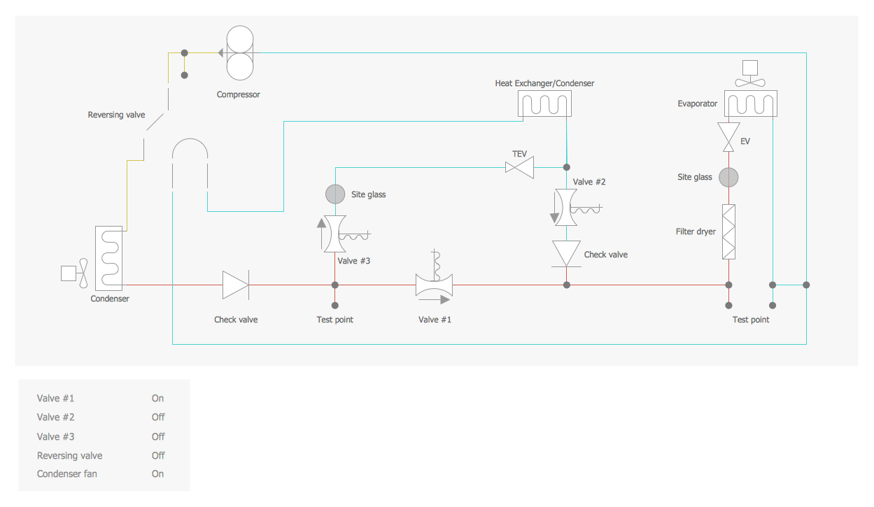 This HVAC schematics sample visualizes a diagram of a Central Air Pool Heater. It was designed on the base of illustration that accompanies the "Central Air Pool Heater" post placed at the Nathan Stratton's blog and depicts the house cool mode of a central air pool heater. Looking at this picture you can observe the movement of hot gas leaving the compressor and running to the condenser, where it condenses into a liquid. When passing through the filter dryer and the site glass to the evaporator, the liquid flashes into a gas. As for the cold gas, it runs down and outside to the compressor, and then the cycle starts once again. The HVAC Plans Solution from the Building Plans area of ConceptDraw Solution Park provides the useful drawing tools for quick, simple and effective designs for the HVAC business plan, HVAC floor plan, HVAC marketing plan of any complexity.