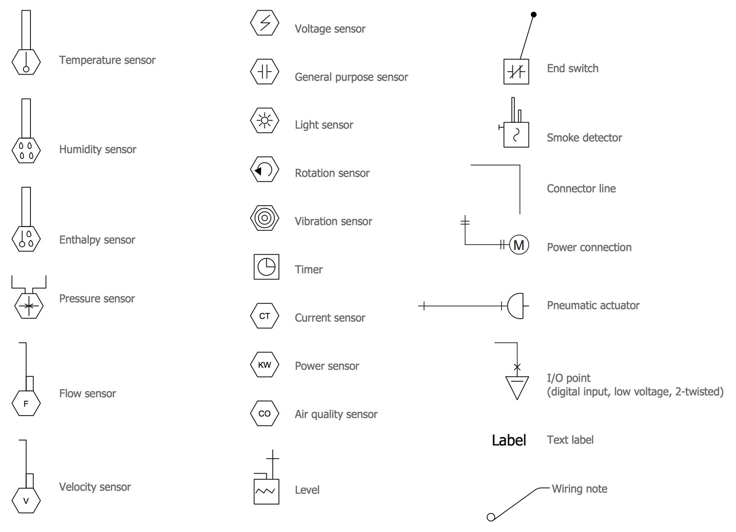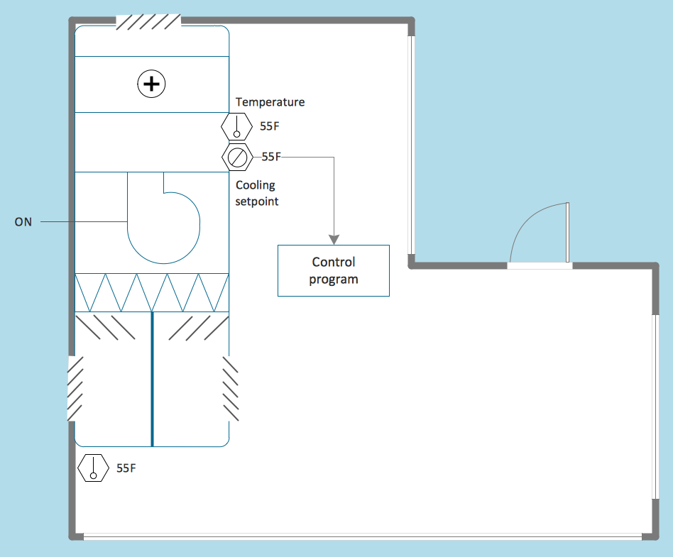 This sample diagram created with the help of tools of ConceptDraw's HVAC Plans Solution shows a sample of HVAC-system design with all its elements labeled. The HVAC (heating, ventilation, and air conditioning) is a technology of indoor and vehicular environmental comfort. There are represented the Digital Unit Ventilator Control and the temperature sensors of air handler digital thermostat control. The thermostat (from Greek "thermos" that meanings "hot" and "statos" that meanings "are standing") is a device used to maintain the temperature near a desired setpoint by means of using the heating and cooling devices, by switching them on or off, and regulating the flow of heat transfer. The cooling setpoint is set on 55F on this HVAC diagram and is controlled by the program. The thermostats are incredibly useful and widespread today and can be met as individual devices and control units, and as the components of a heater and air conditioners.