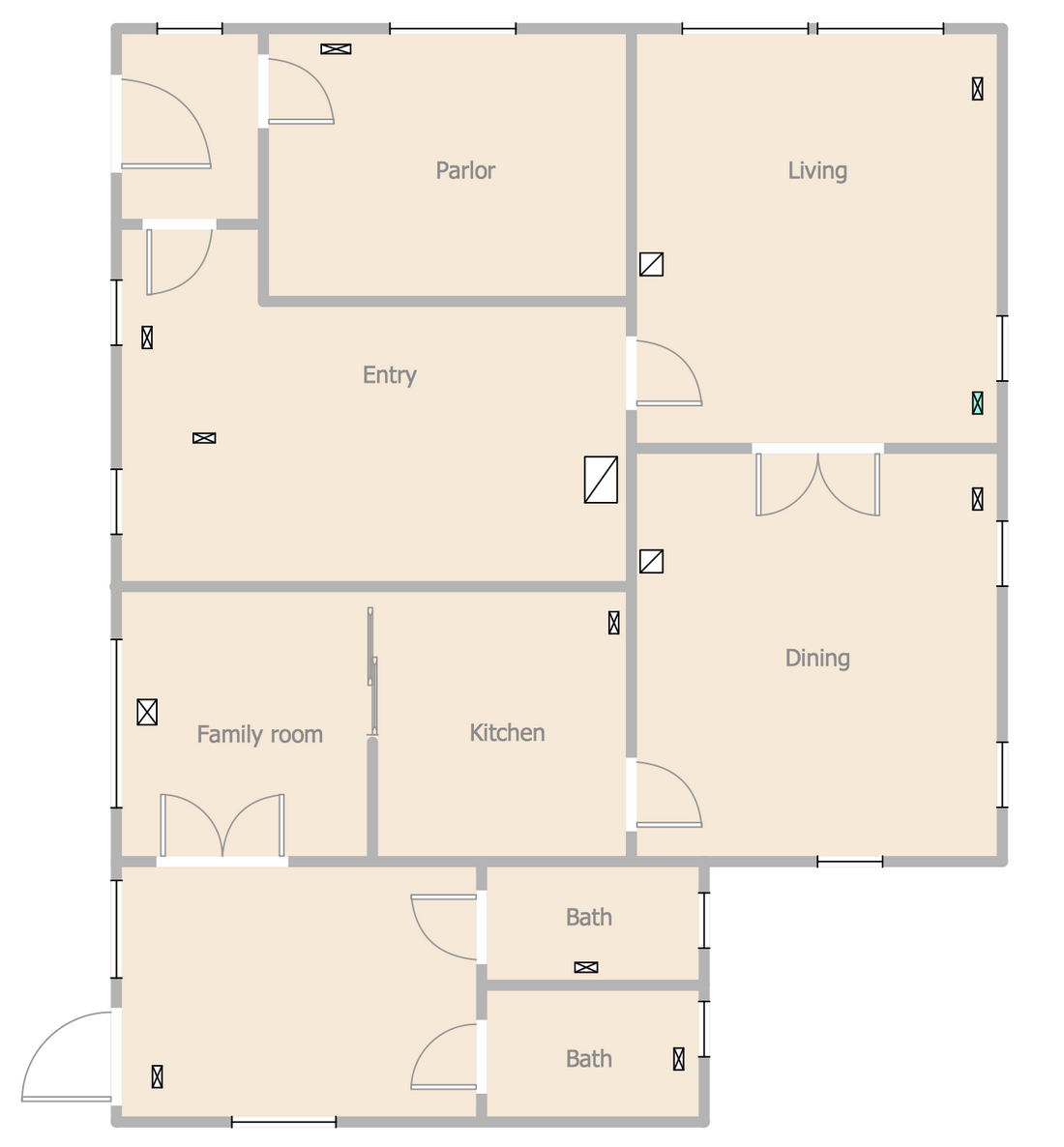 This house HVAC floor plan sample demonstrates the ventilation system air supply diffusers and air exhaust grilles layout. All they are placed on the detailed floor plan of an apartment, which includes a lot of rooms and auxiliary premises — entry, parlor, living room, dining room, family room, kitchen and two bath rooms. The represented system of ventilation has a mixed character. The installed devices allow realizing a mechanical ventilation, also, through the use of such planned openings as windows and doors there is realized the natural ventilation ensuring the flow of outside air to the premises. In order to not distract the attention, this plan does not contain any elements of furniture and decor that are present in a real apartment, but if necessary, you can always add them to your plan from the ConceptDraw Solution Park libraries in a matter of seconds, making the plan even more detailed.