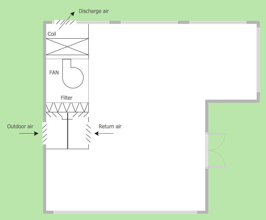 This mechanical room HVAC plan representing a Blow Through Unit Ventilator depicts the layout of air handler or air handling unit (AHU) equipment that includes the mixing chamber, fan, air filter, heat exchanger coil, diffusers. The ventilation allows ensuring the high quality of indoor air, conducting the process of replacing or changing the air within some space, also allowing controlling the air temperature and wetness, eliminating the excessive moisture if it is needed, the odors of different nature, smoke, dust, contaminants and bacteria. The ventilation lets one avoid the air stagnation in a closed space and supposes the realization of air circulating, letting the air in the outside be filled with oxygen. Extensive libraries of predesigned vector objects from the HVAC Plans Solution offered by ConceptDraw Solution Park cut the planning time for designers, architects, builders and other stakeholders allowing them to create different blueprints and plans for HVAC in a few minutes.