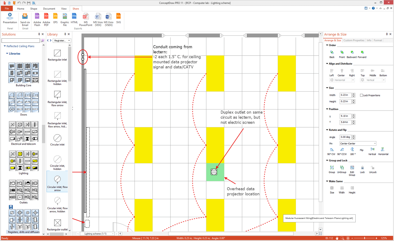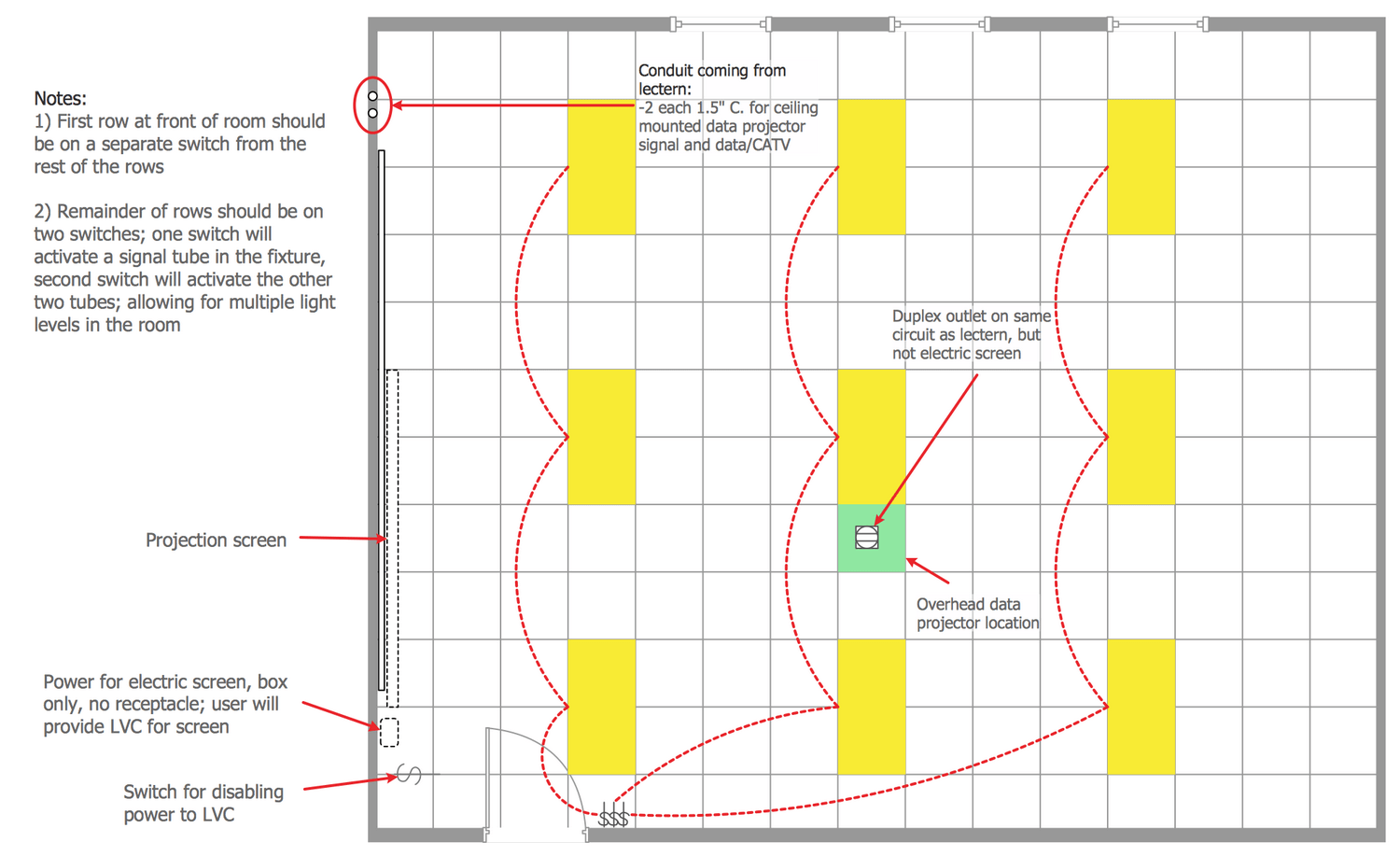This sample illustrates some ceiling ideas for a computer classroom. It is a lighting scheme of a computer lab with an overhead projector designed on the base of Reflected Ceiling Plan published on a website of Elon University, NC. The overhead projector is an equipment often used in classrooms, it allows organizing the low-cost interactive environment and is helpful for educators when organizing an interesting and effective educational process. Near the plan, you can find the notes that represent the explanations about what equipment is placed at this premises, their specifics and characteristics, and other additional information. The data projector's location is highlighted in a special way on the plan. The Reflected Ceiling Plans solution from the Building Plans area of ConceptDraw Solution Park with libraries of predesigned reflected ceiling plan symbols was created specially to help you design professional-looking Reflected ceiling plans of any level of complexity in mere minutes.