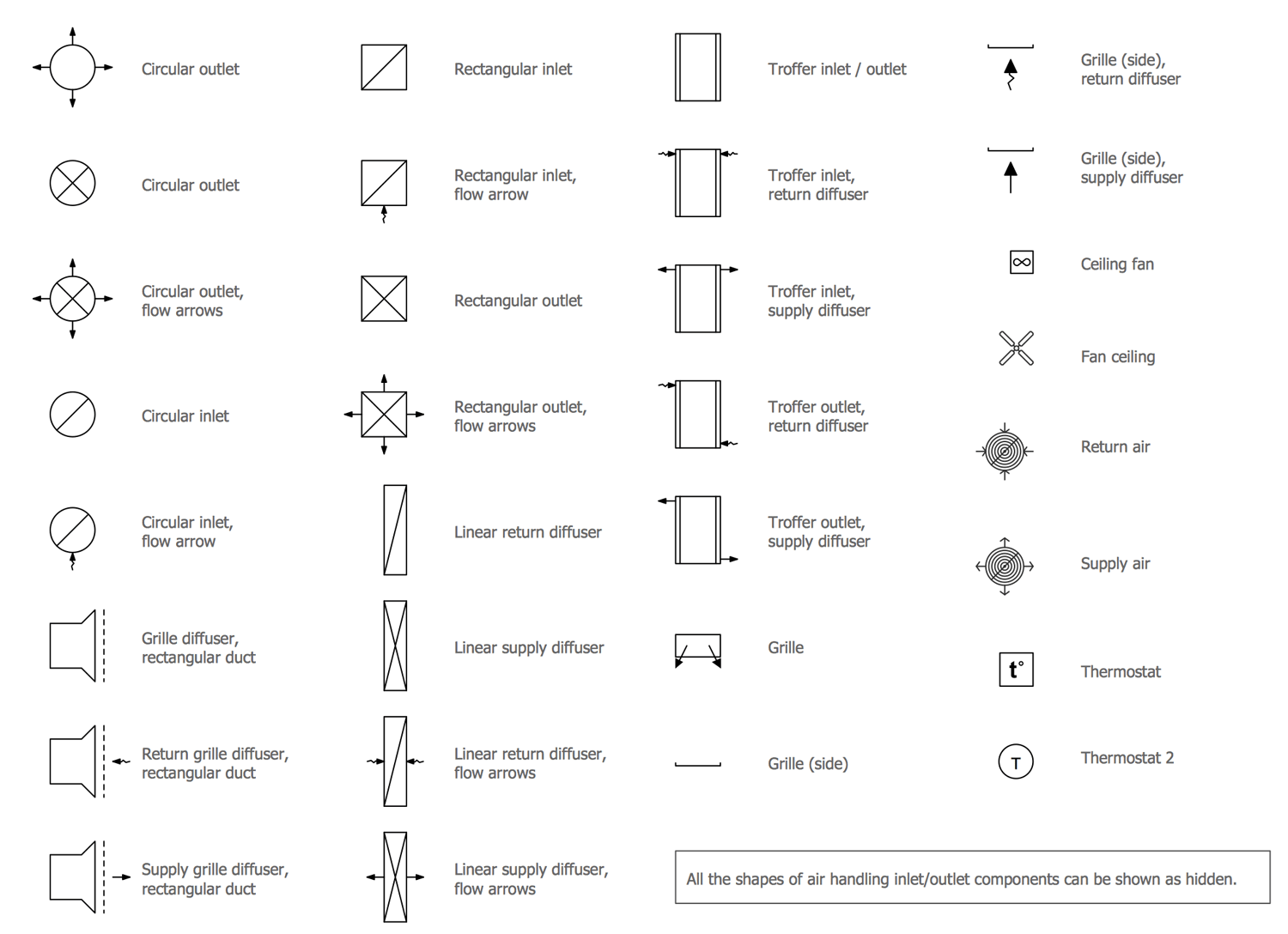 This sample shows a reflected ceiling plan layout on the plan of an apartment. It's no accident, the RCP always has the same orientation as the floor plan but contains the designated ceiling elements, as if you looked overhand through the transparent ceiling. This plan is based on the article "How to Read a Reflected Ceiling Plan" from the wikiHow.com website. It is a simple basic plan with a minimal quantity of ceiling equipment, there are only grill diffusers (rectangular ducts), linear return diffusers, and rectangular inlets used at this premises. Are you a designer or simply going to repair your room, flat or house? Use ConceptDraw DIAGRAM and its Reflected Ceiling Plans solution to make a reality out of your ceiling ideas for living room, kitchen, bathroom, etc. Note that colorful plans are more successful at attracting attention, however, it is desirable to keep them in one style with other building documentation.