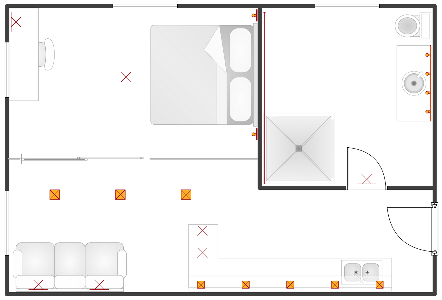 This Reflected Ceiling Plan template was developed and included to the Reflected Ceiling Plans Solution to the easier creation of Reflected Ceiling Plans as most as possible. It represents the floor plan as looking on it down from above at the interior and ceiling, so alongside with room’s furniture you can see location of all light fixtures, luminaires, lights, lamps, t-bars ceiling patterns and all other items that can be suspended from the ceiling, as well as electrical equipment, electrical outlets, switches, fire and security special equipment, and numerous kinds of sensors. This template contains also the special vector shapes and settings for building layout of ceiling tiles and lighting panels, HVAC grilles and diffusers. When you need to draw promptly a clear and beautiful plan of premises lighting, it is extremely convenient to have at hand a such template. Correct the premises plan and just add required items from the predefined libraries, and the work will be done.