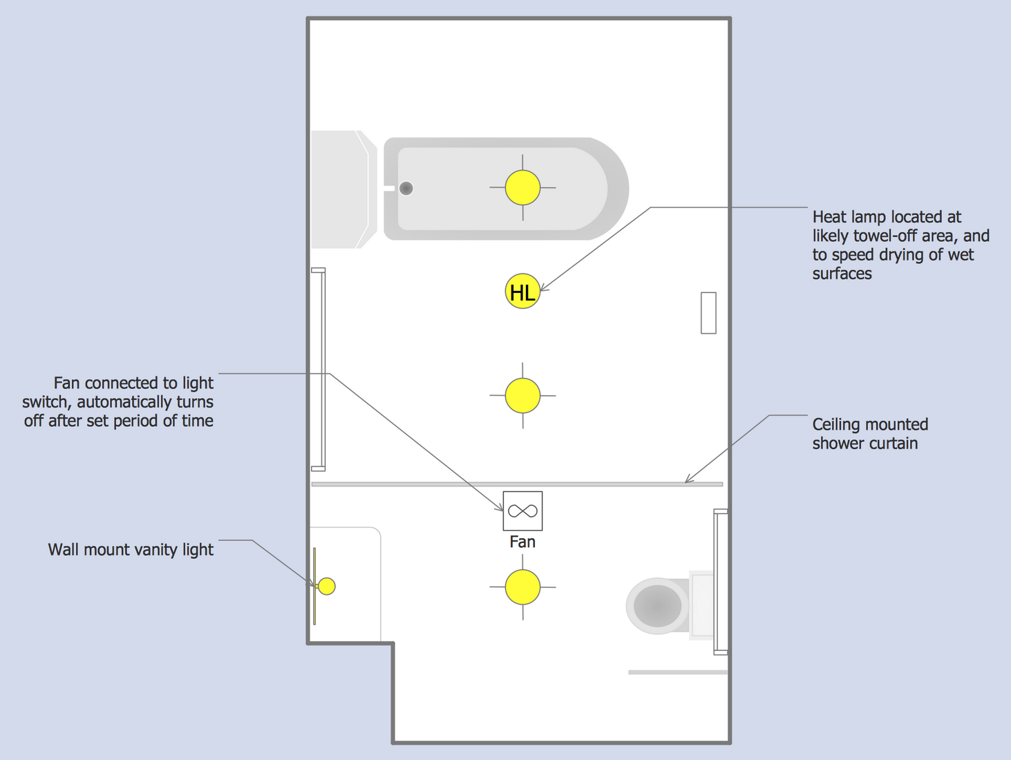 This sample illustrates the prototype bathroom design plan represented on the website of the Oregon Department of Human Services (DHS), USA. The bathroom design can suppose the simple lighting with one-type lighting fixtures or several types of illuminators according to the premises requirements, but due to the fact that bathrooms are usually the rooms without windows, the artificial lighting is necessary to be carried out there for using day and night. This plan includes the circular outlets, the heat lamp located at likely towel-off area and speeding the drying of wet surfaces, the fan connected to a light switch and automatically turning off after a certain period of time, the wall mount vanity light, and the ceiling mounted shower curtain. The main sources of light are visually highlighted on the plan with yellow color. If used light spectrums will be different, you can display this on the plan. To reflect additional information about your ceiling ideas, use callouts.