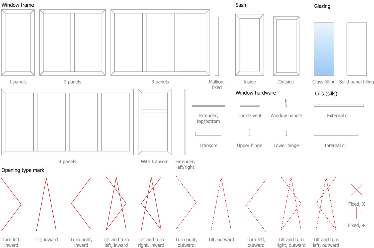 ConceptDraw DIAGRAM enhanced with newest Tilt and Turn Windows solution provides you with professional tools and ready-to-use vector design objects making the process of window design simple and comfortable, allowing easily model the windows constructions, to draw the sketches and schematics of windows, to create detailed drawings of window designs combining different types of sashes, designing the tilt inward and outward windows, single, double window or multi-panel windows, single hung window, double hung window, and many other window types with depiction of sizes and types of turn constructions.