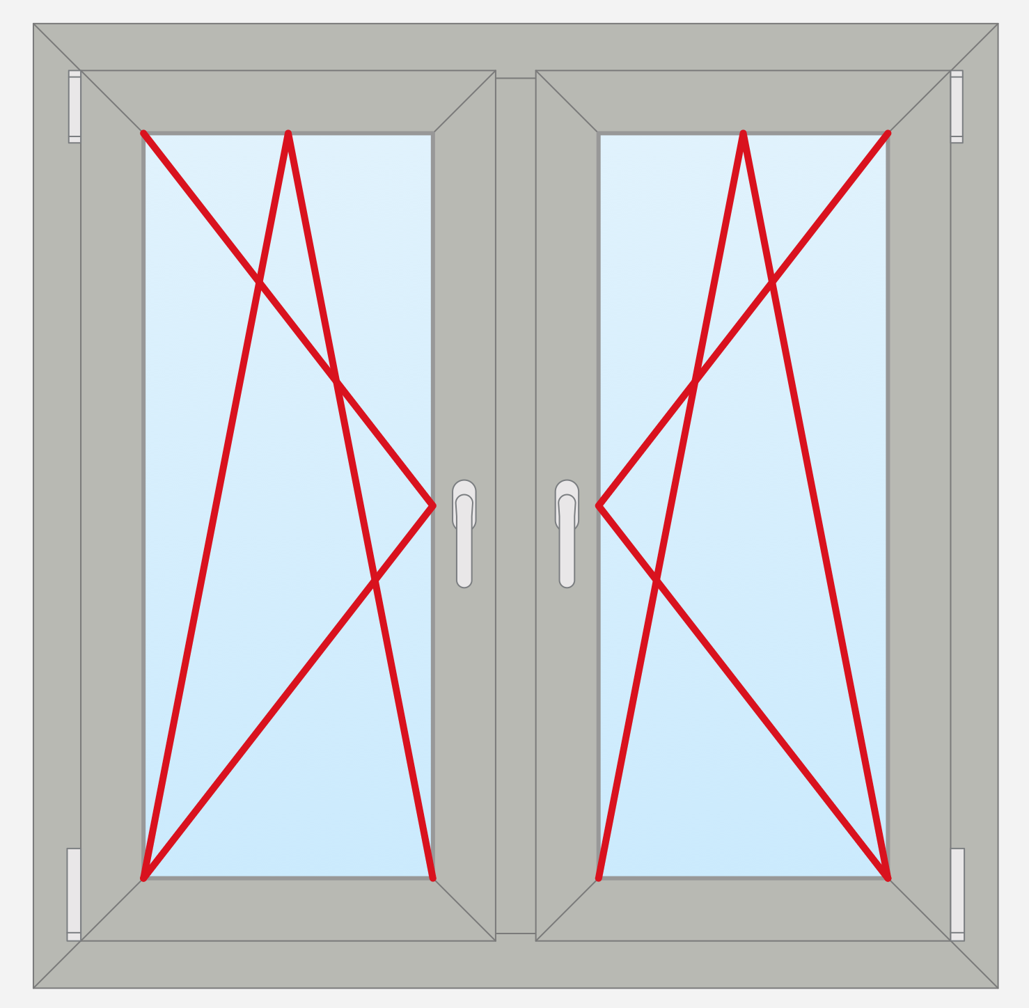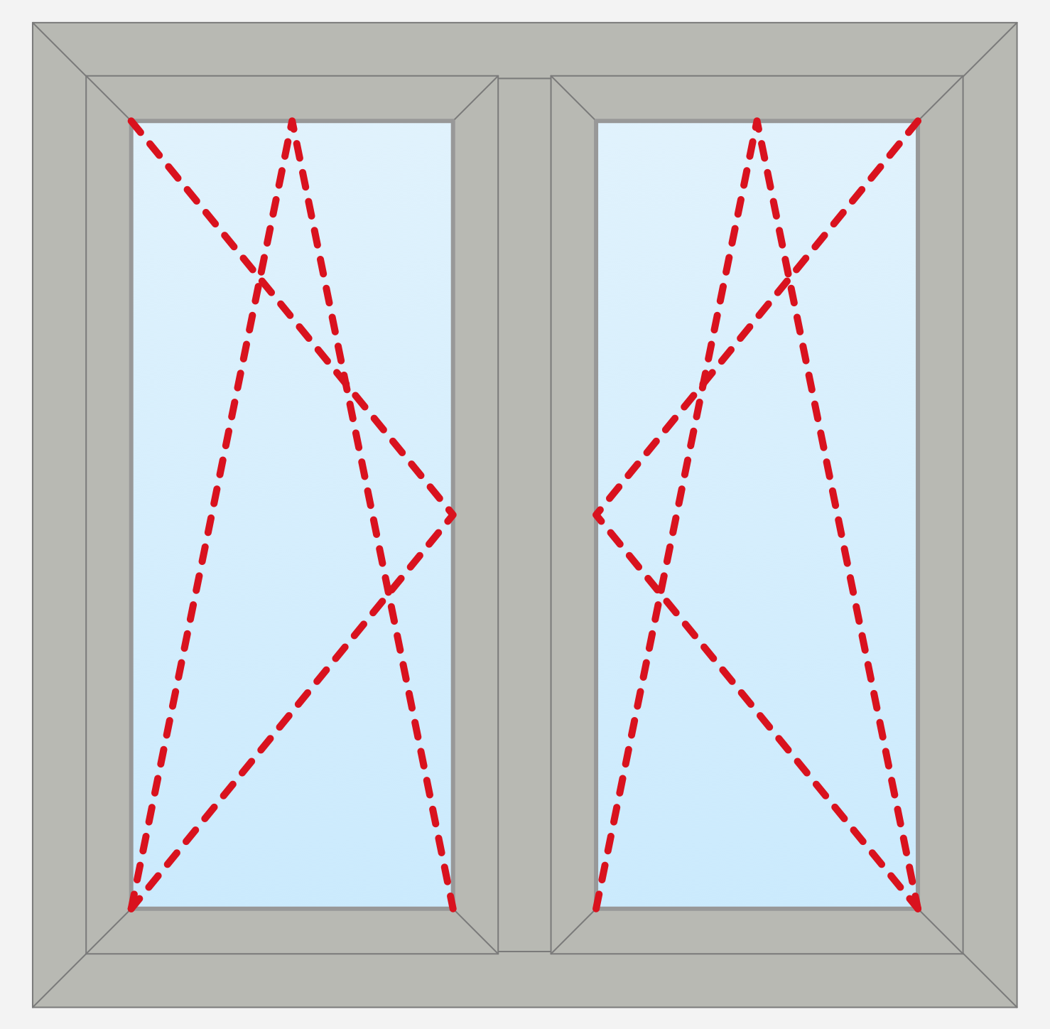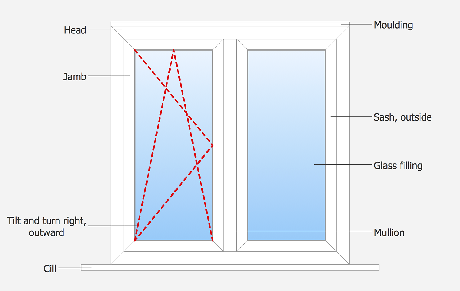 Windows are the main sources of sunshine to the premises, from their size and design depends the quantity of incoming light and comfort of staying at the room. This window design example shows the inside view of standard window with two symmetrical panels. As for the way of window’s tilt and turn, both panels are equivalent, they can be turn and opened in opposite sides. You are free to change the method of opening in seconds using the predesigned vector objects from the Tilt and Turn Windows solution libraries.