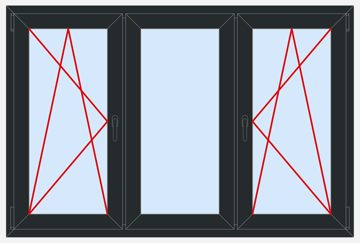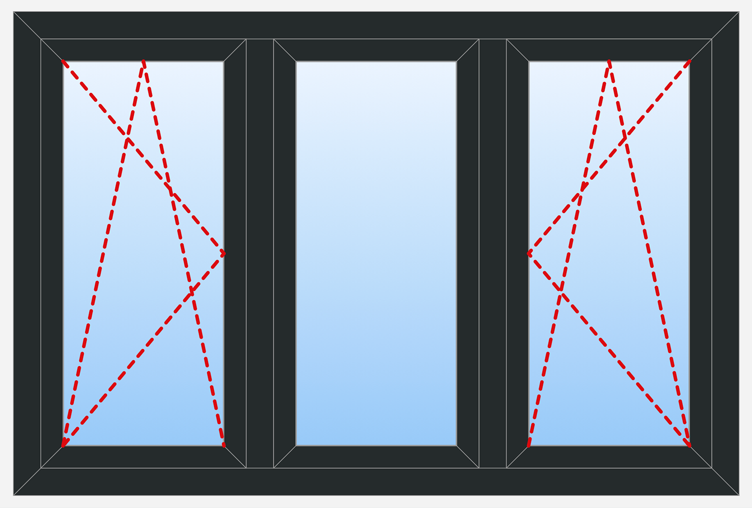 The variety of types and styles of windows' constructions and designs, the variants of coats and modern technologies of filling the glazing units with gases effective for energy saving, lets to find easily the right option for particular conditions of use. This sketch example illustrates the outside view of triple panel window, two panels from them are tilt and turn, the middle panel is vice versa fixed.