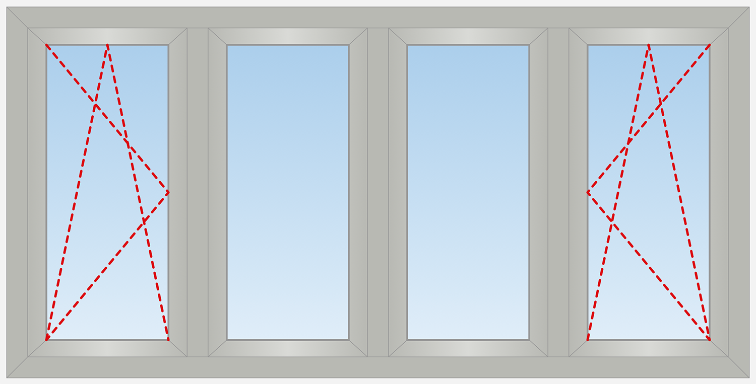 This sample shows the inside view of the panel window, which is divided into four sections or panels, all them are glazed. Two boundary panels are tilt and turn, two middle panels are fixed. ConceptDraw DIAGRAM software enhanced with Tilt and Turn Windows solution is perfect for professional designing the windows with different number of panels of diverse functionality.