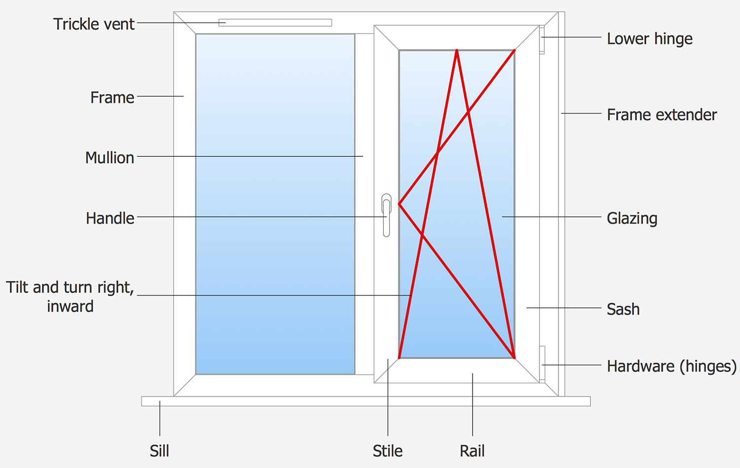The structure of the metal-plastic windows is quite complex, especially if to compare them with traditional wooden windows. The plastic window is constructed from a variety of parts and its key feature is a modular structure. This example shows the inside view of tilt and turn window, describes its structure and components: frame, sash, glazing, hinges (lower and hardware), mullion, trickle vent, frame extender, stile, rail, still, tilt and turn visual designations. This information is extremely useful not only for those who is related with manufacture of windows and their installation, but also is necessary for all people for correct windows exploitation.