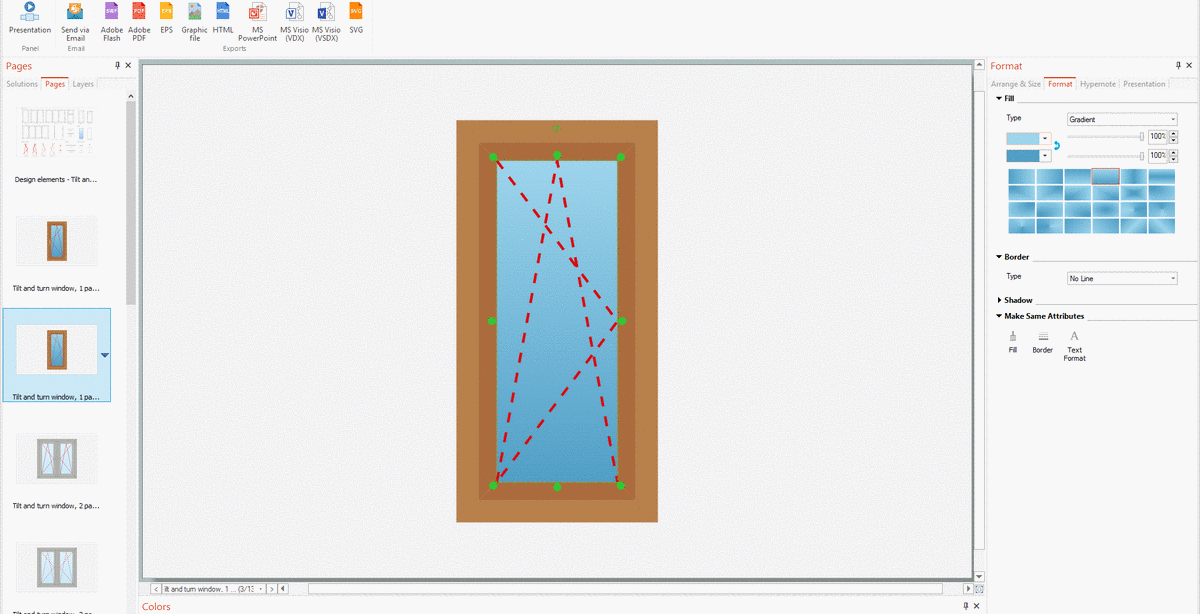 All source documents are vector graphic documents which are always available for modifying, reviewing and/or converting to many different formats, such as MS PowerPoint, PDF file, MS Visio, and many other graphic ones from the ConceptDraw Solution Park or ConceptDraw STORE. The Tilt and Turn Windows solution is available to all ConceptDraw DIAGRAM users to get installed and used while working in the ConceptDraw DIAGRAM diagramming and drawing software.