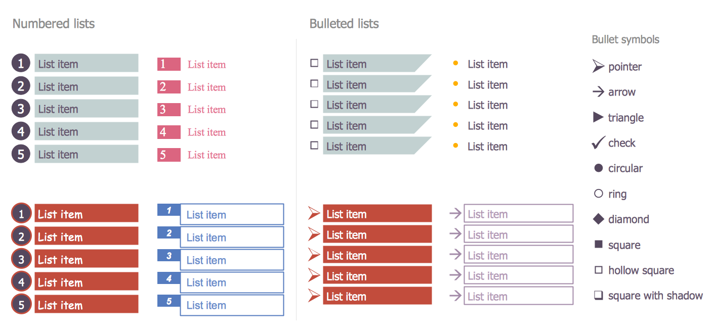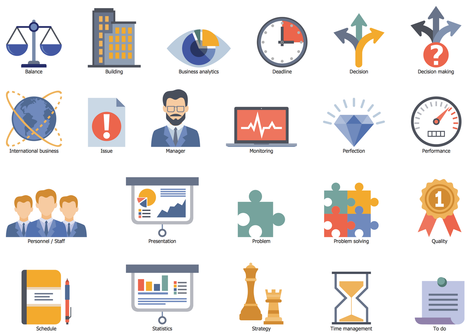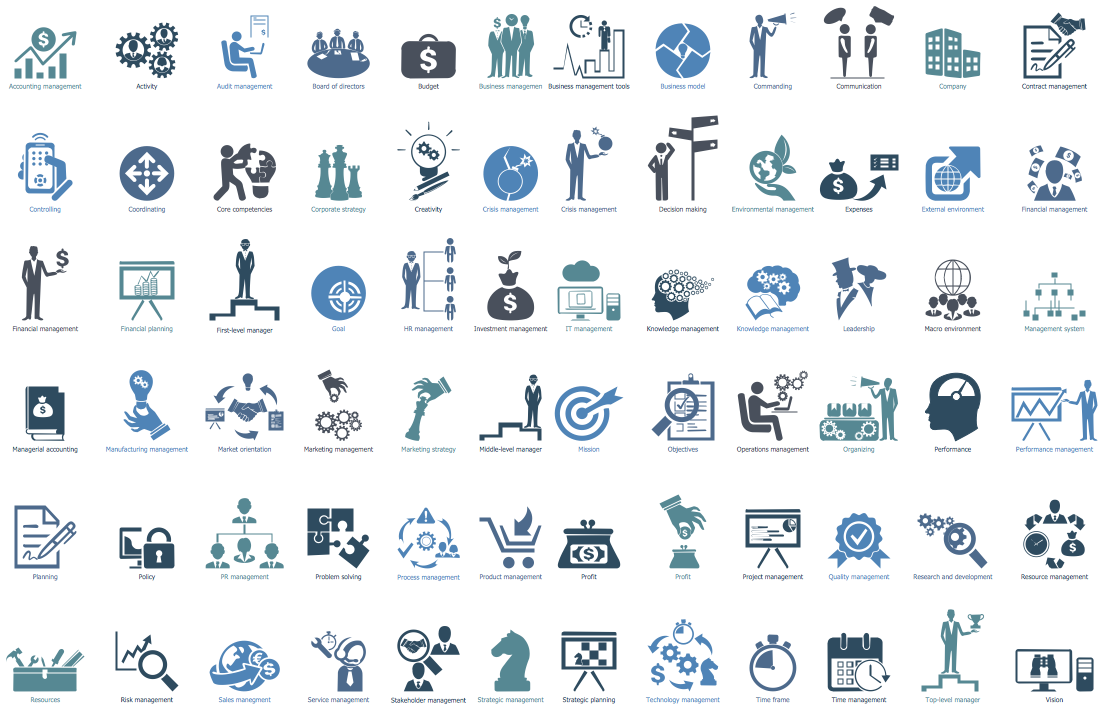 There are 14 stencil libraries containing 364 vector objects and 10 examples in the Management Infographics solution.