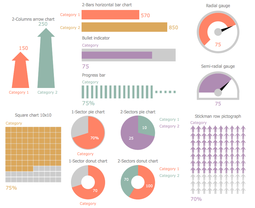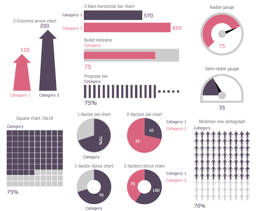 The Pie Charts solution allows you to create charts that can be used in statistics, business, and mass media for composition comparison (i.e. to visualize the percentage for the parts of one total).