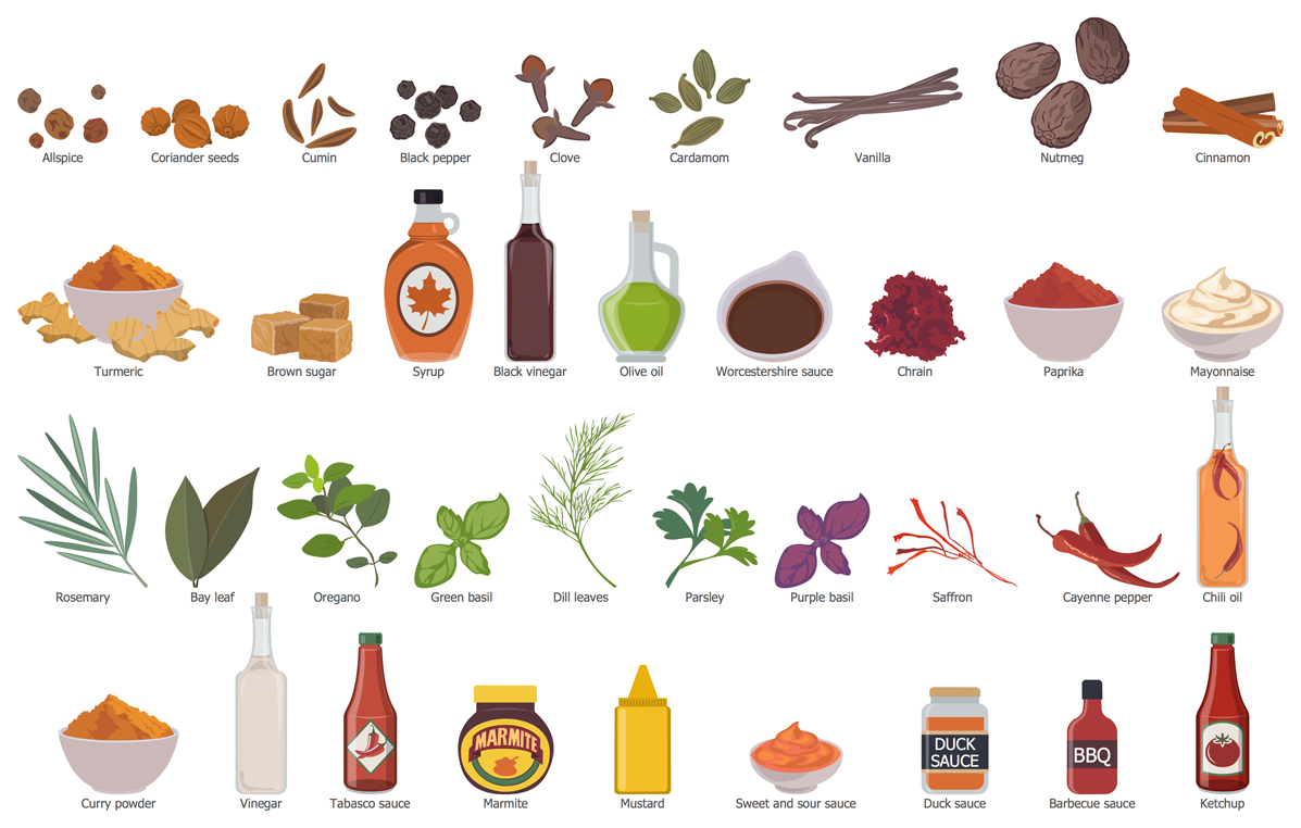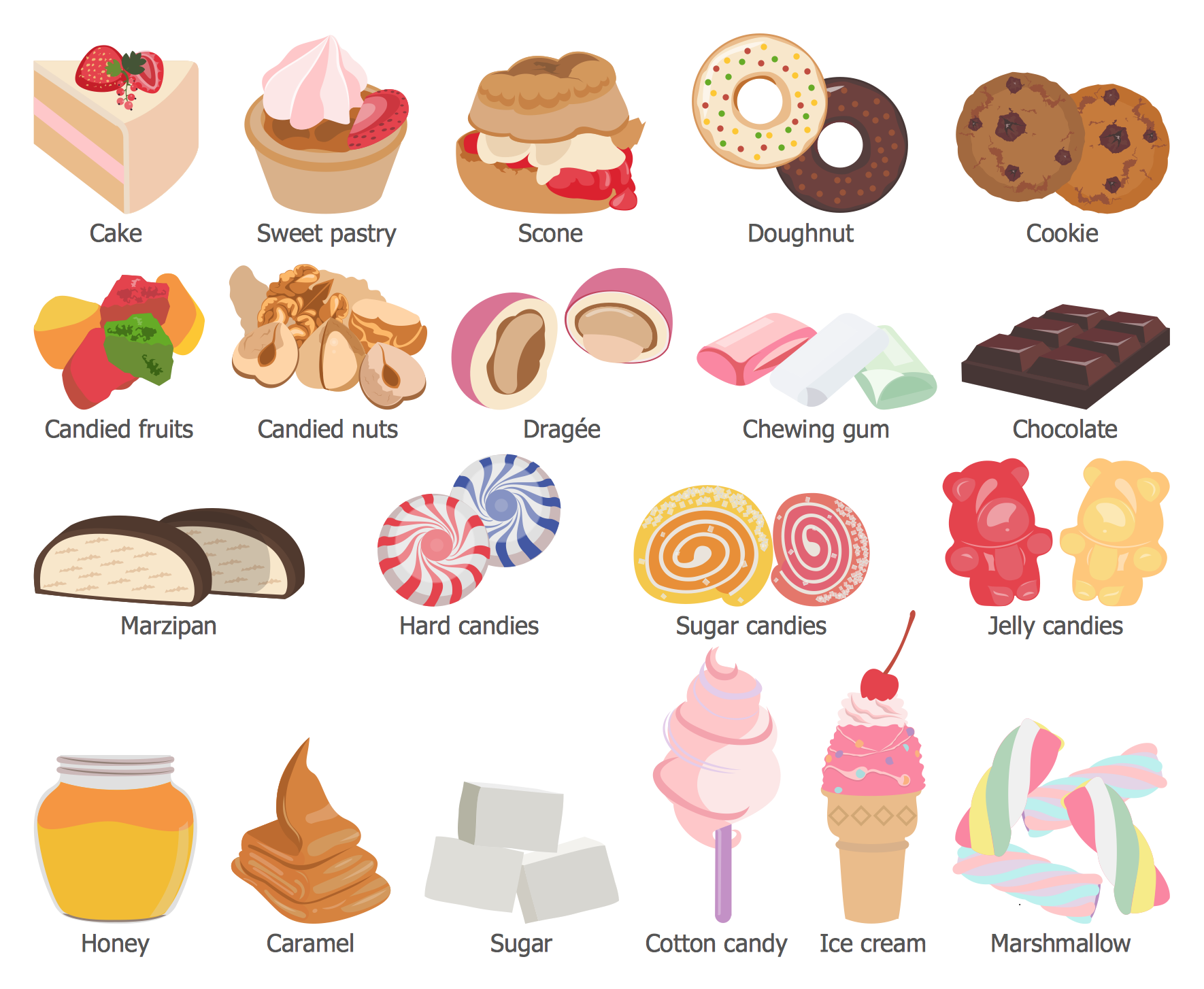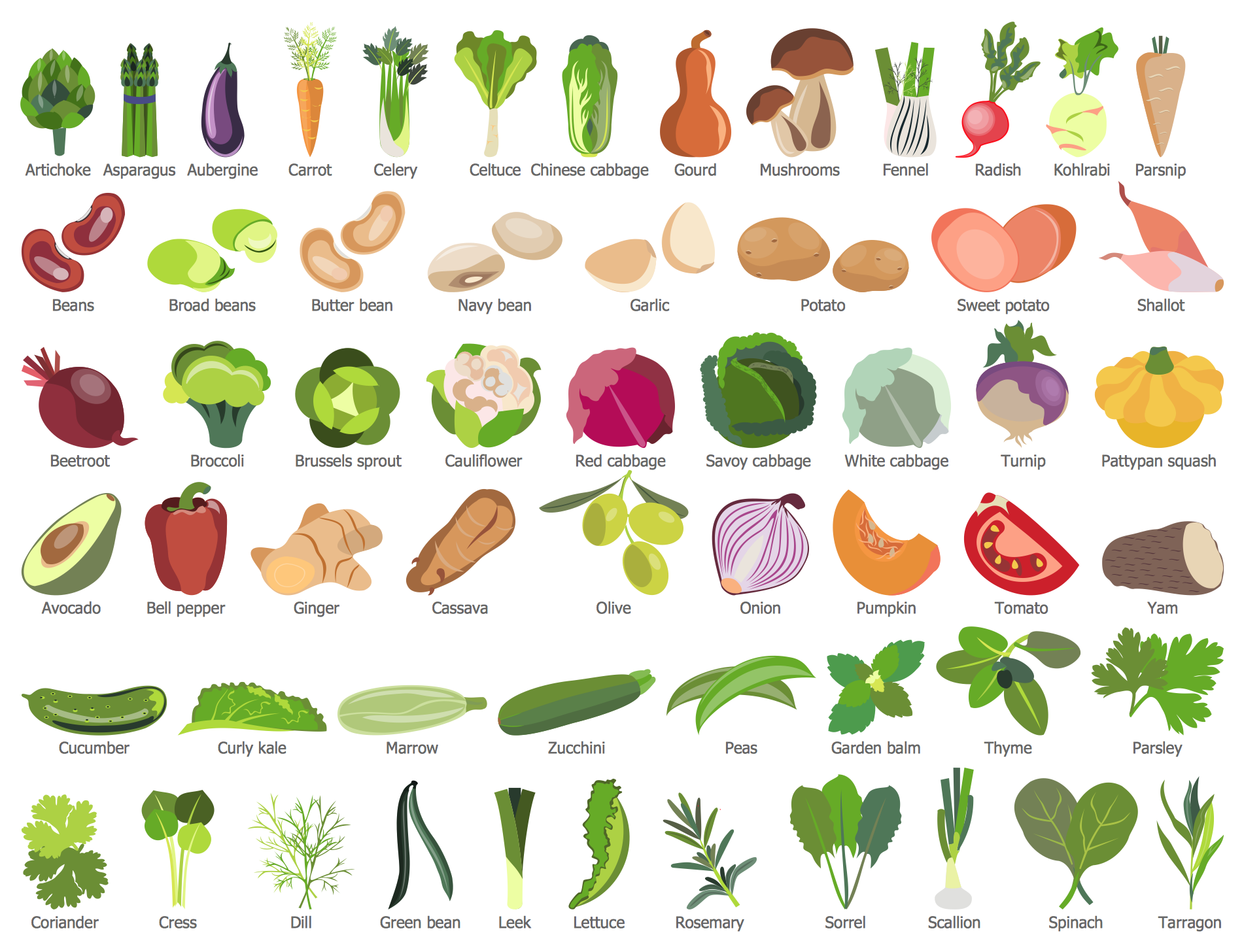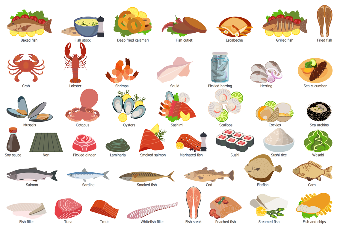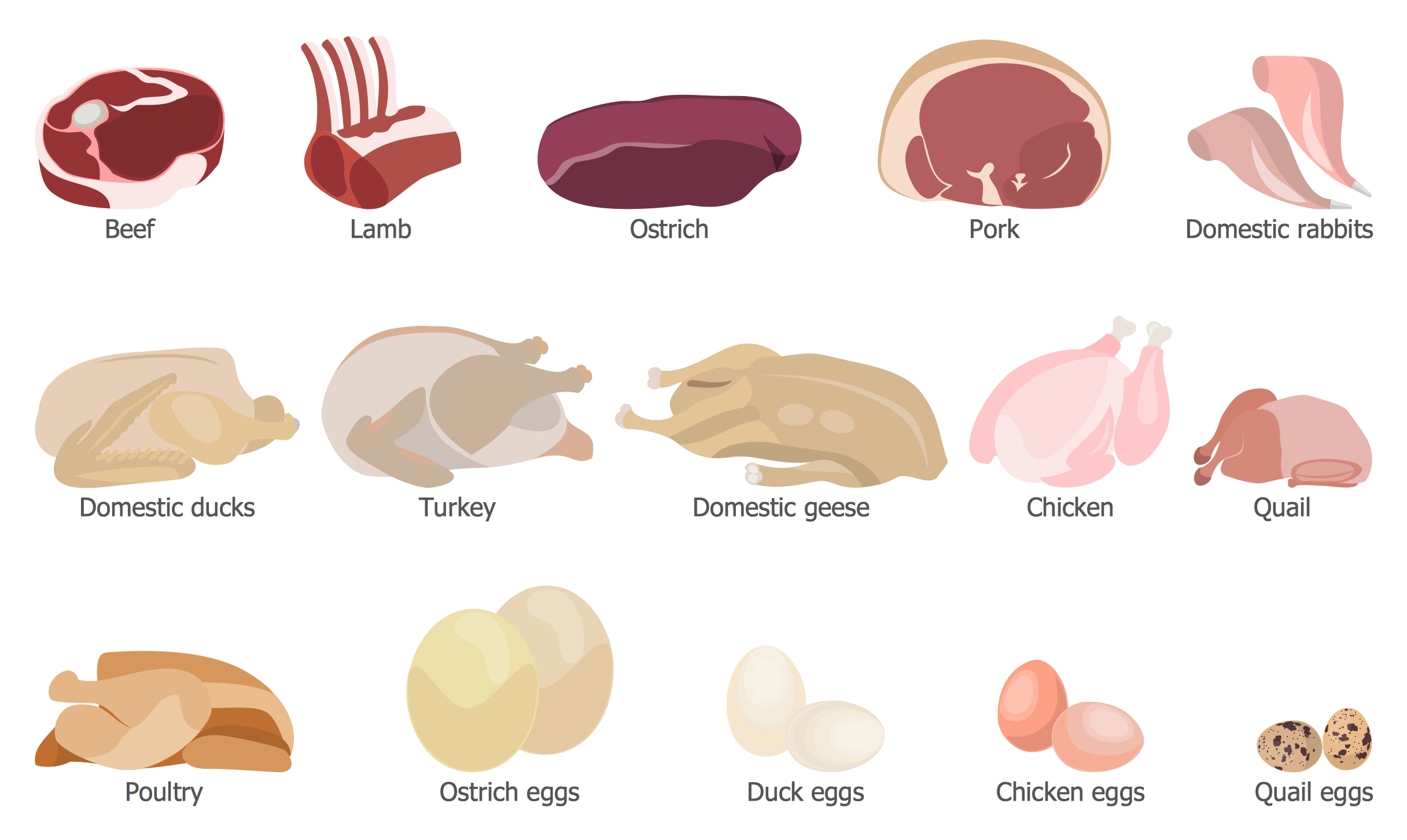 Design eye-catching health food illustrations and decorate healthy food recipes with help of predesigned bright and appetizing healthy foods clipart.