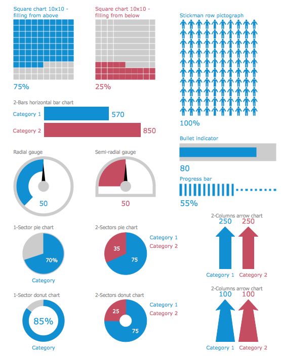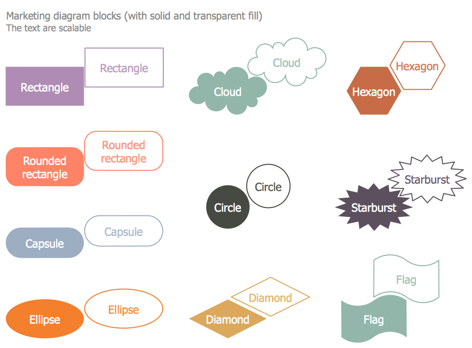 There are 14 stencil libraries containing 327 vector objects and 14 examples in the Marketing Infographics solution.