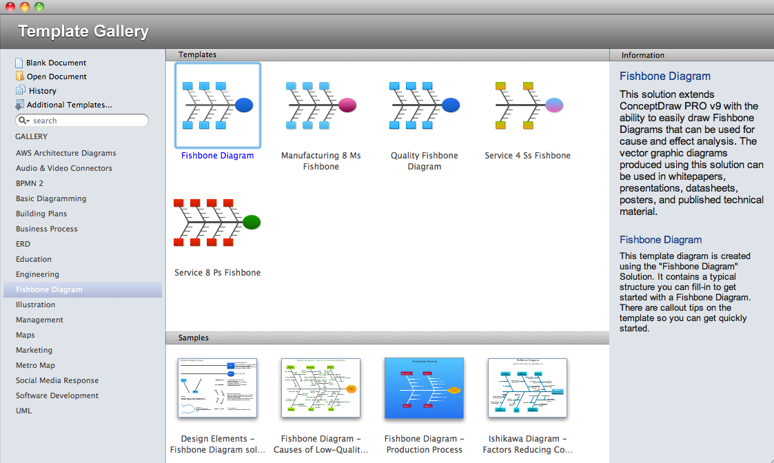 There are a few samples that you see on this page which were created in the ConceptDraw DIAGRAM application by using the Fishbone Diagram solution. Some of the solution's capabilities as well as the professional results which you can achieve are all demonstrated here on this page.