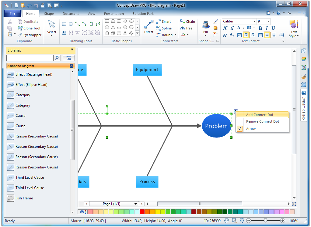 This sample diagram using the "Fishbone Diagram" Solution shows the most common causes and effects that occur when assembling a cause-and-effect analysis session.