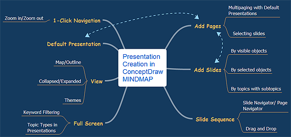 ConceptDraw MINDMAP software is an effective helper not only in creating the bright and attractive maps that organize your ideas and thoughts but also in construction effective and memorable presentations with their use. ConceptDraw MINDMAP allows you to create the Mind Map presentations, to send them via e-mail, to represent remotely to the participants of the Skype conference call, and to exchange the presentations with people using other presentations making software.