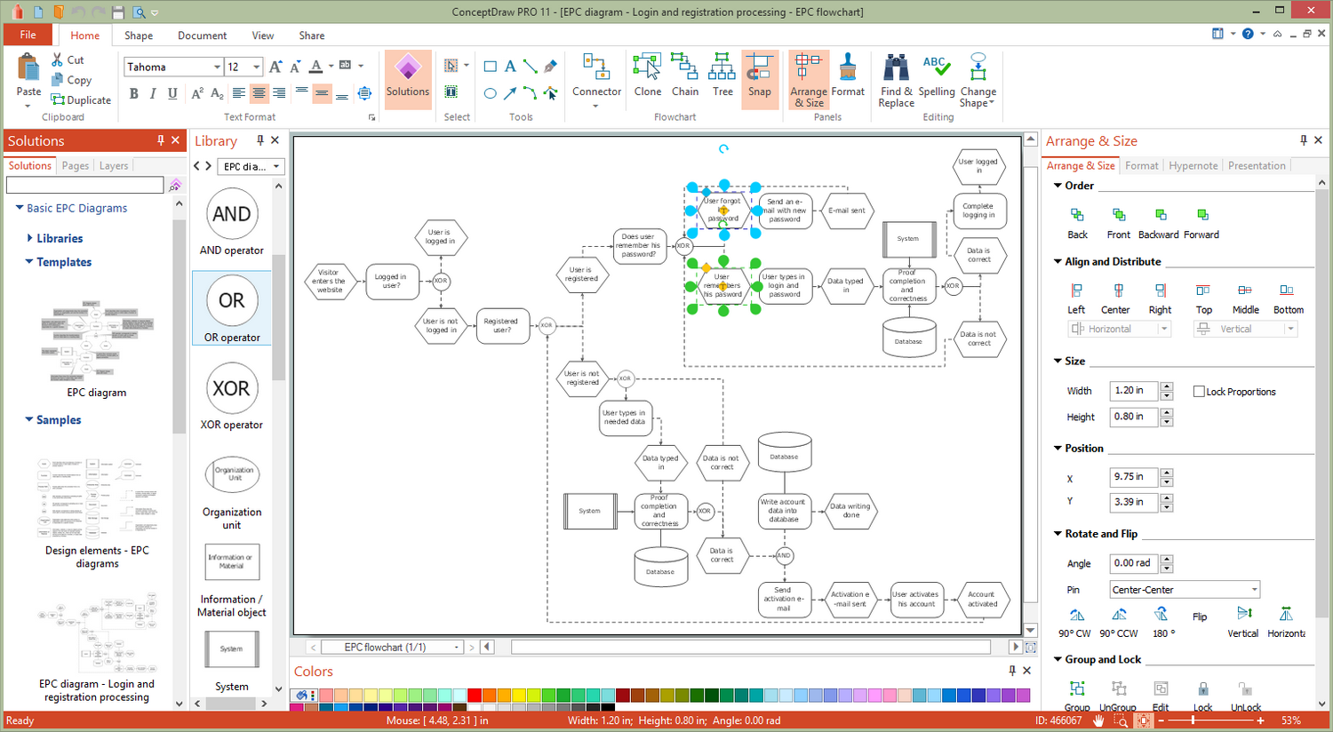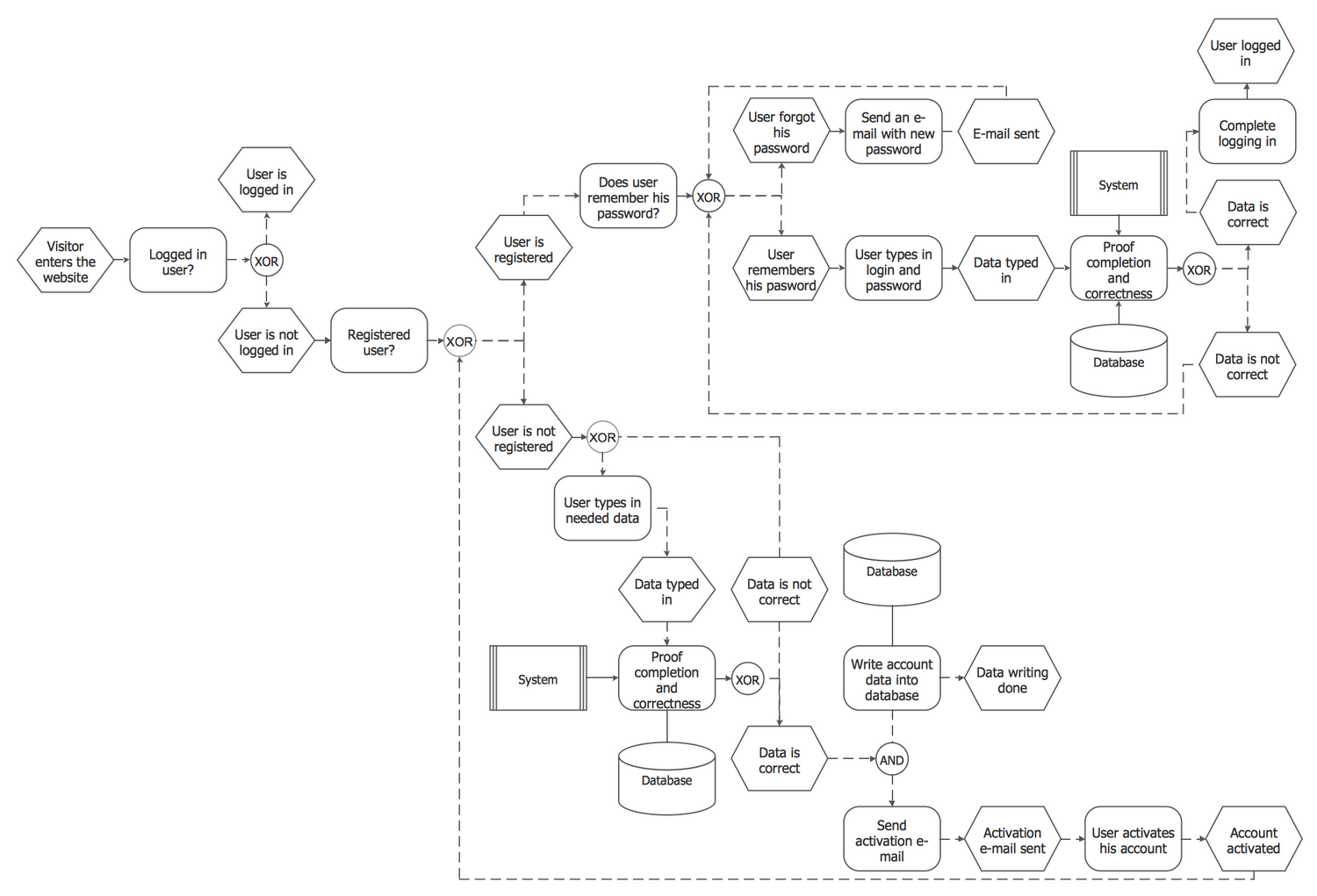 Using ConceptDraw DIAGRAM connectors to create EPC diagram is an intuitive and time-saving solution. This example shows an EPC diagram that clearly illustrates a login and registration processing procedure step by step and shows how all events can impact the process flow.