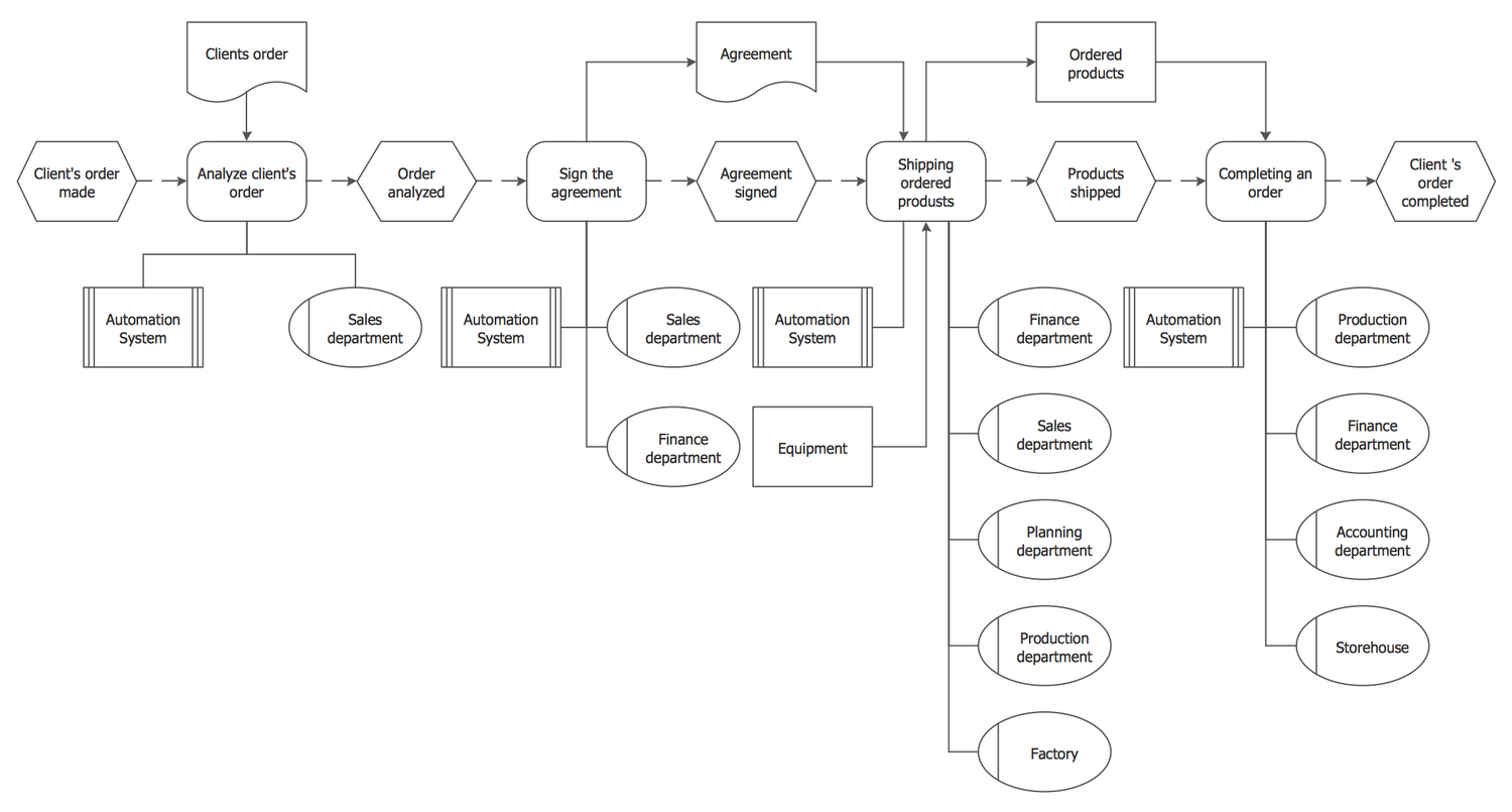 Using ConceptDraw DIAGRAM connectors to create EPC diagram is an intuitive and time-saving solution. This example shows an EPC diagram that clearly illustrates an order processing procedure step by step. It can be used as visual material for employee training or as a source for any automation initiative.