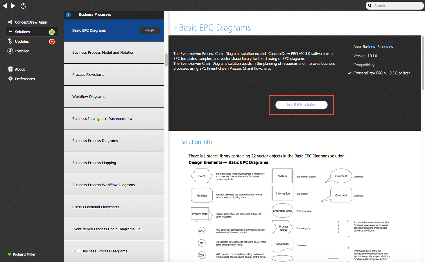 After ConceptDraw STORE and ConceptDraw DIAGRAM are downloaded and installed, you can install the Basic EPC Diagrams solution from the ConceptDraw STORE.