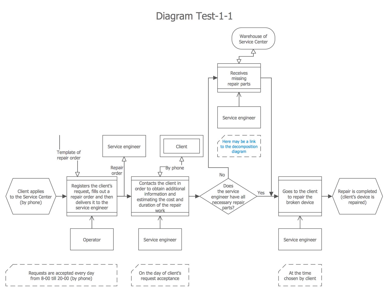 This CH-1 diagram models the business process of repairing the household devices by the service center. This process includes the defined list of steps and particularities, which are represented in the diagram. The repair works are executed at the client’s place after receiving the prior telephone request by a call center operator, which takes calls every day from 8-00 until 20-00. For each request in a writing view is formalized the repair order that is delivered to the corresponding service engineer. He needs to contact with a client to clarify the details of a failure, to estimate the repair cost, to reach an agreement for the suitable time of arrival, to take the needed details on a warehouse and then repair the broken device. This Business Process Flowchart explains all steps in a clear and visual manner using the symbols predefined by the CH-1 notation, and can be used for educational needs or as detailed instruction for workers of a service center.