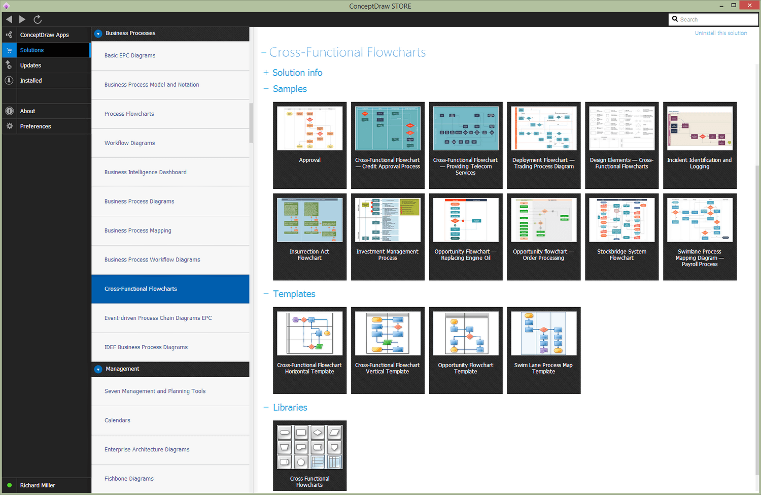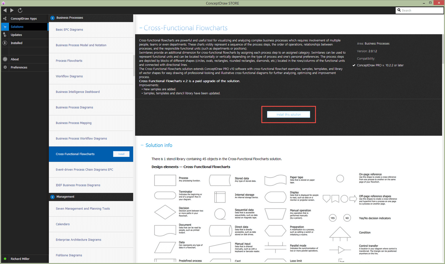 After ConceptDraw STORE and ConceptDraw DIAGRAM are downloaded and installed, you can install the Cross-Functional Flowcharts solution from the ConceptDraw STORE.