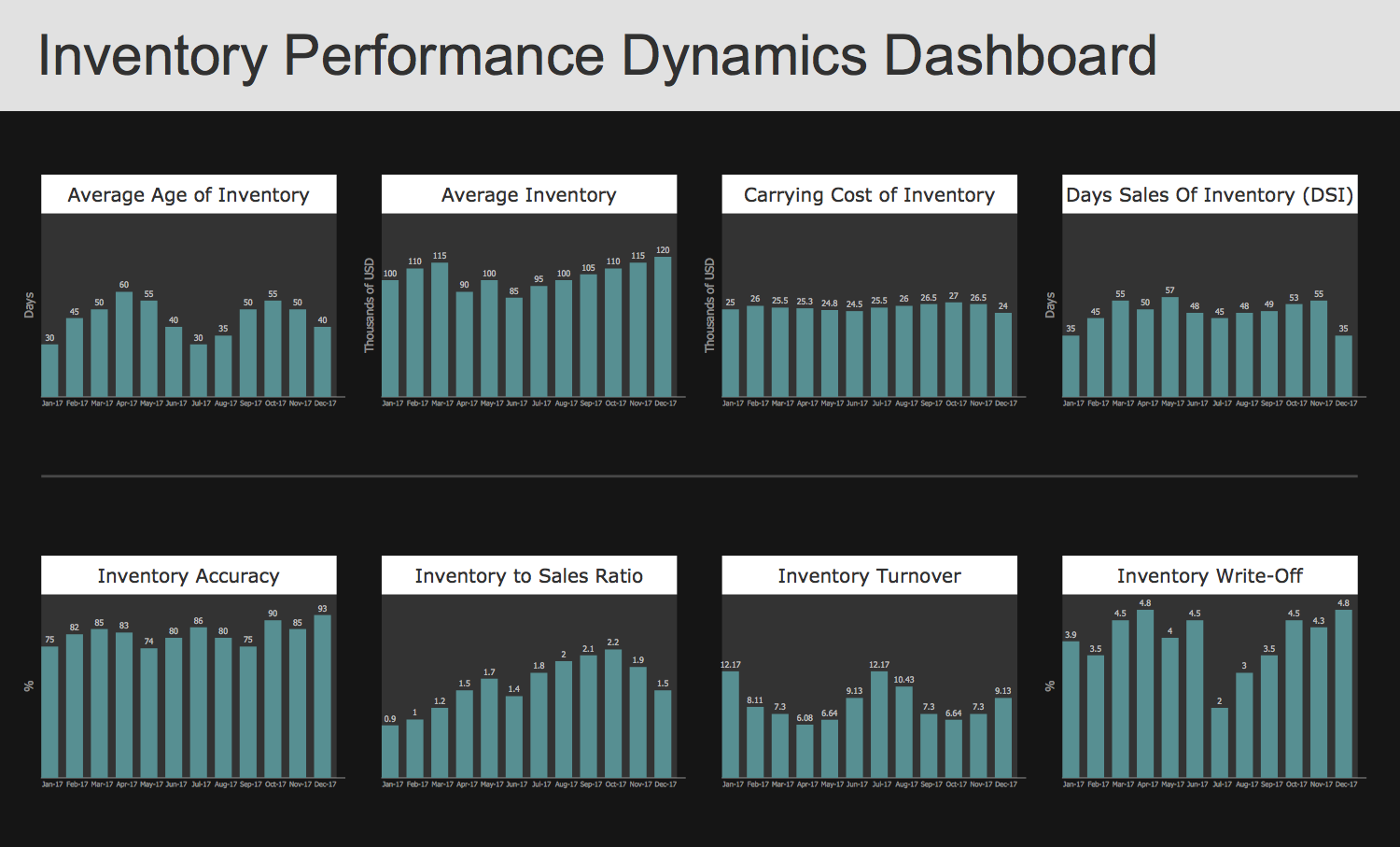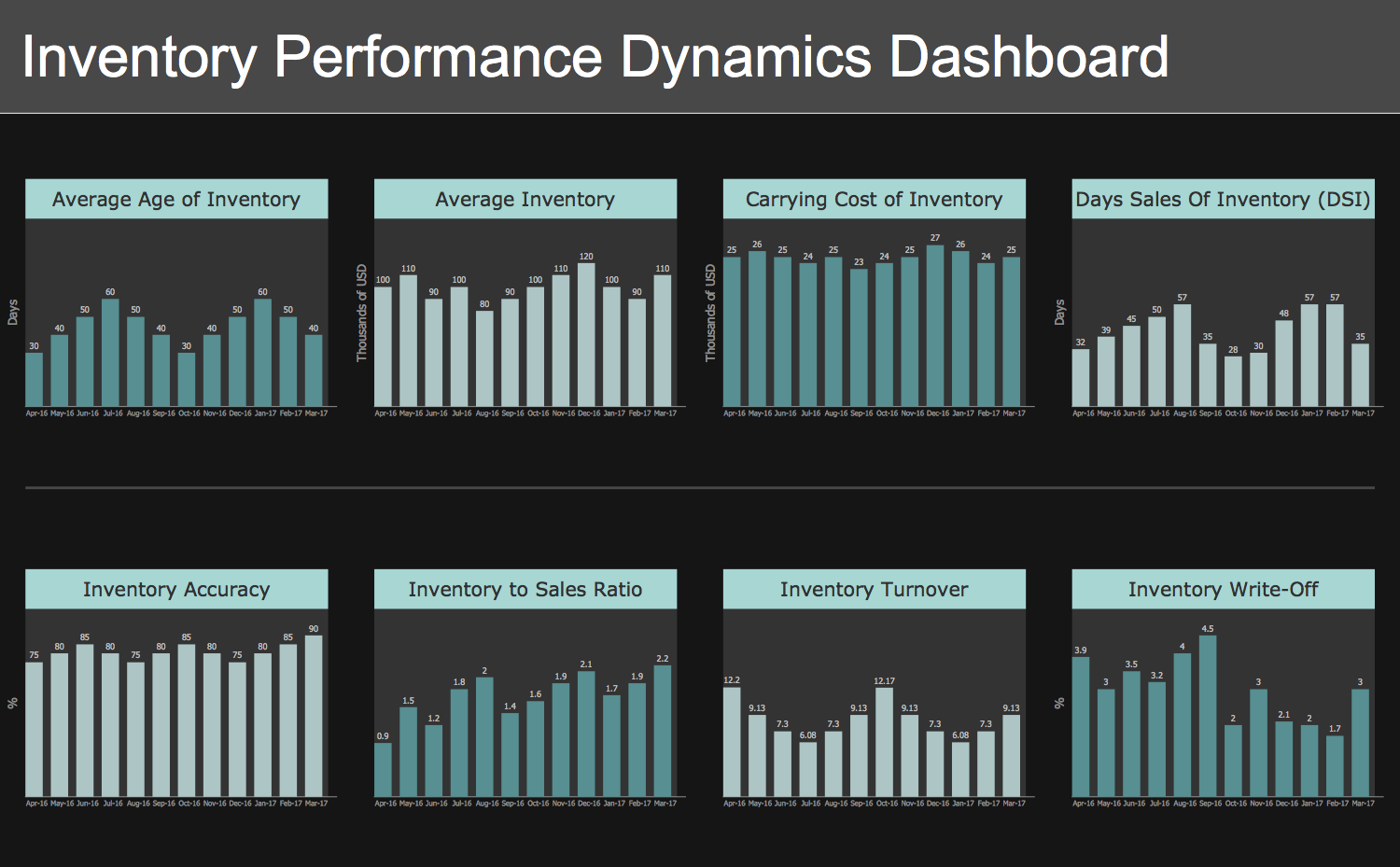 This example displays the Inventory Performance Dynamics Dashboard that is useful for representing and analysis the dynamics of changes in business metrics and key performance indicators (KPIs) of inventory management in last 12 months. The changes of KPIs are visually illustrated with help of Column Chart live objects from the Logistic Charts library of Logistic Dashboard solution.