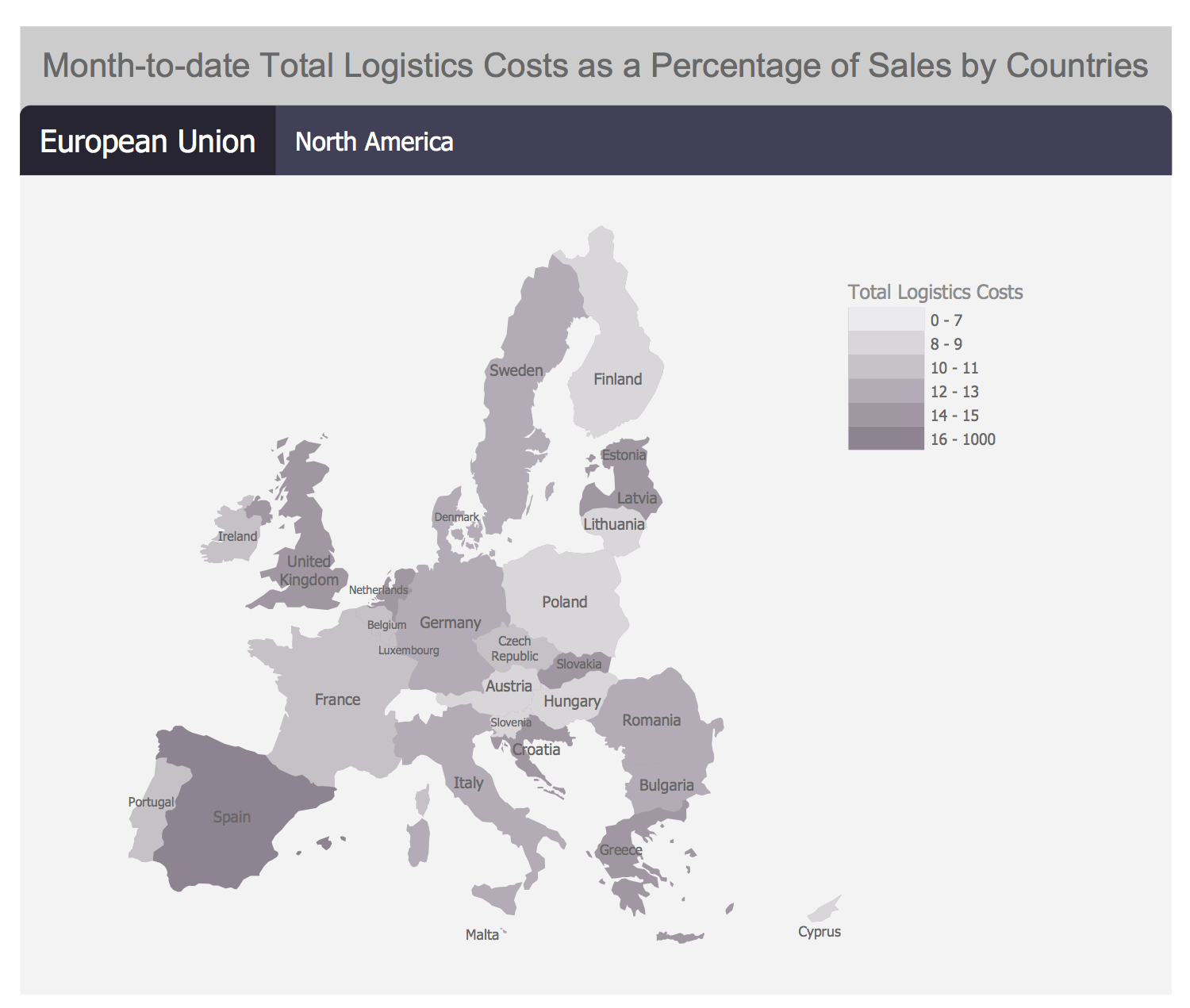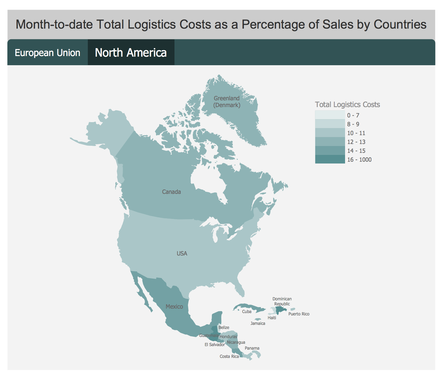 This Total Logistics Costs by Countries sample is represented as a two-page dashboard. Each page contains the map showing the levels of KPI for different countries, for European Union on the first page and for North America on the second. There are 6 levels: up to 7%; 8-9%; 10-11%; 12-13%; 14-15%; 16% and more. The data used by the live object are taken from the connected data source Excel file. If necessary, you can always assign another source file in one click, the data will be automatically updated on your dashboard.