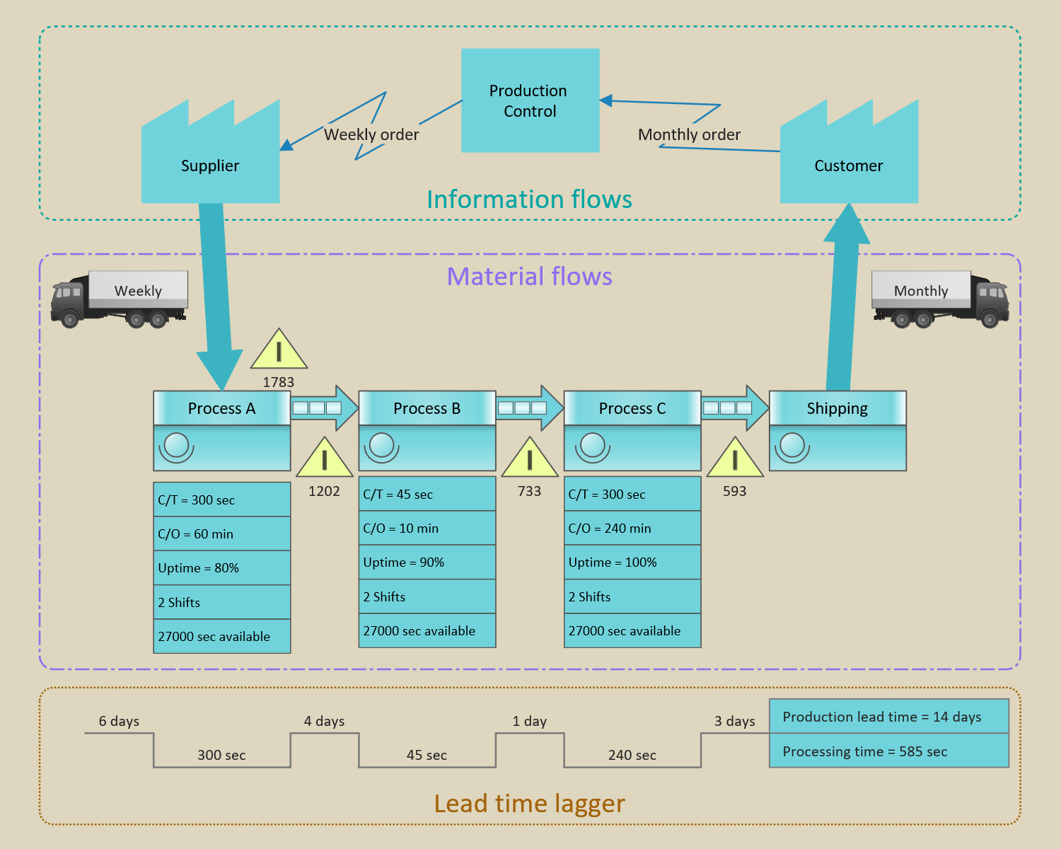 This example of a VSM diagram was drawn using ConceptDraw DIAGRAM with the "Value Stream Mapping" solution from ConceptDraw Solution Park.