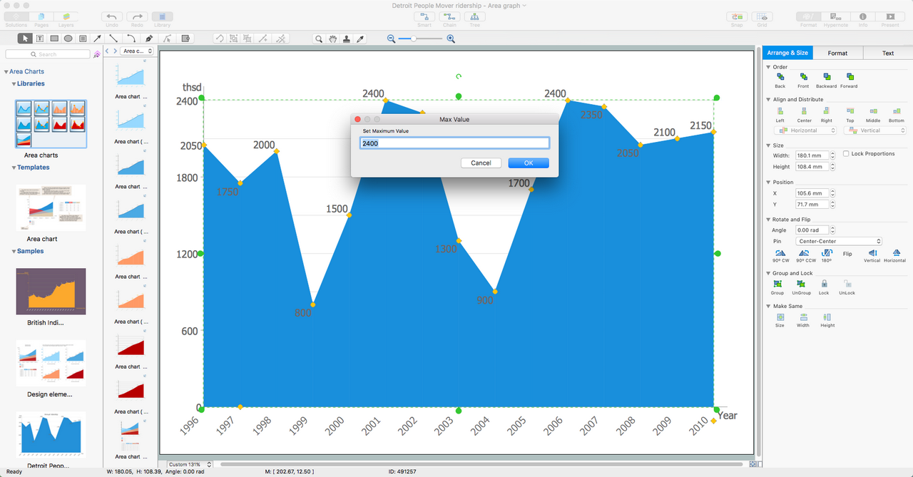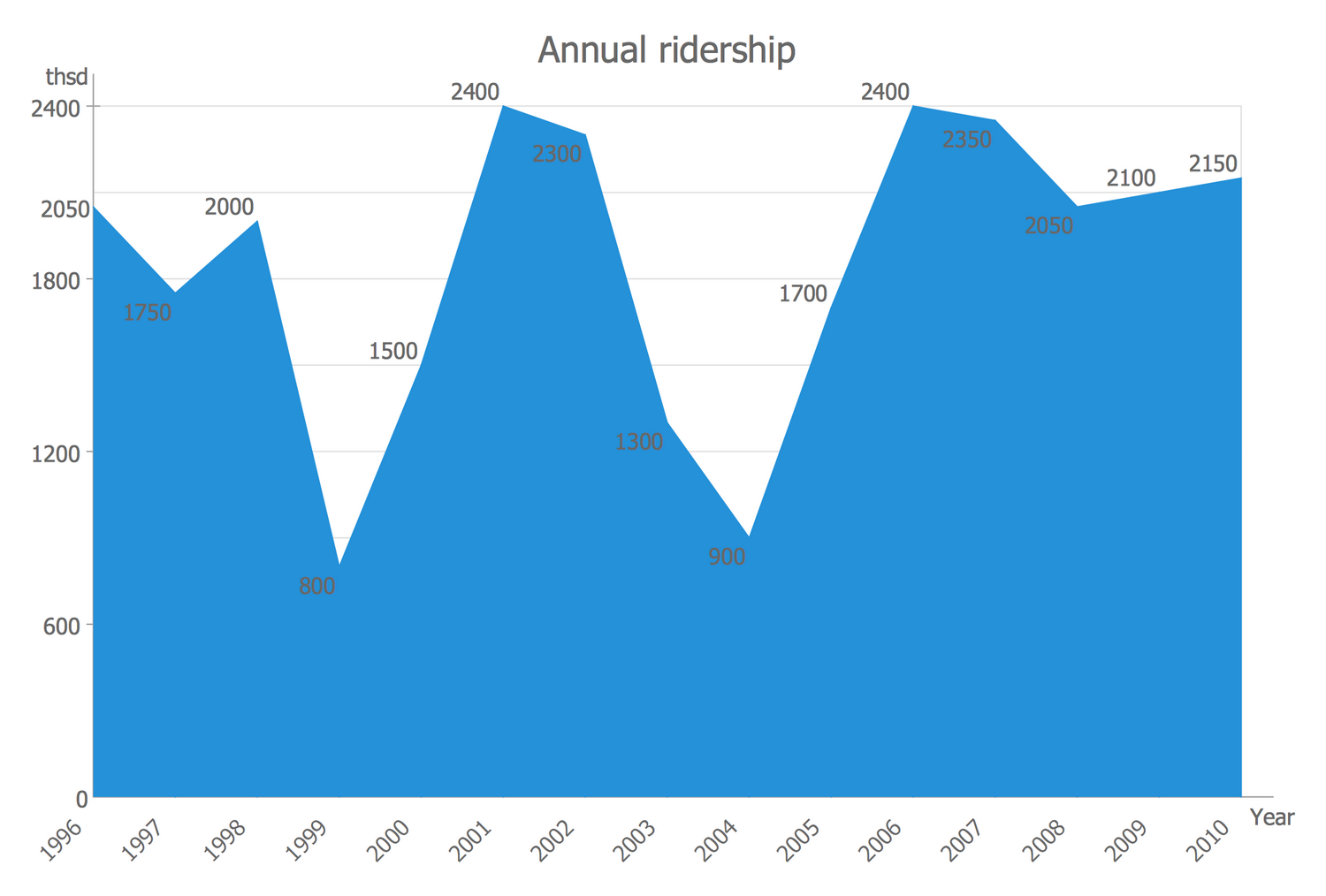 This Area Chart sample designed on the base of the "File DPMridership.jpg" Wikimedia Commons file illustrates the Annual ridership of the Detroit People Mover by years at the period from 1996 to 2010. The encircle single-track automated people mover system Detroit People Mover was built around Downtown Detroit in Michigan in 1987. This Area Chart visually depicts the spikes in annual ridership in 2001 and 2006 to 2400 thousand, and serious falls in 1999 and 2004 to 800 and 900 thousand correspondingly. The illustration and analysis of statistical data are quite important for developing any field of activity. They allow detecting the factors affecting the serious changes for the worse to eliminate them, as well as those ones that lead to success and to advance them. When designing your Area Charts, Surface Area Chart or Polar Area Chart in ConceptDraw DIAGRAM you are free in choosing the color style of your charts and can fully rely on your taste.