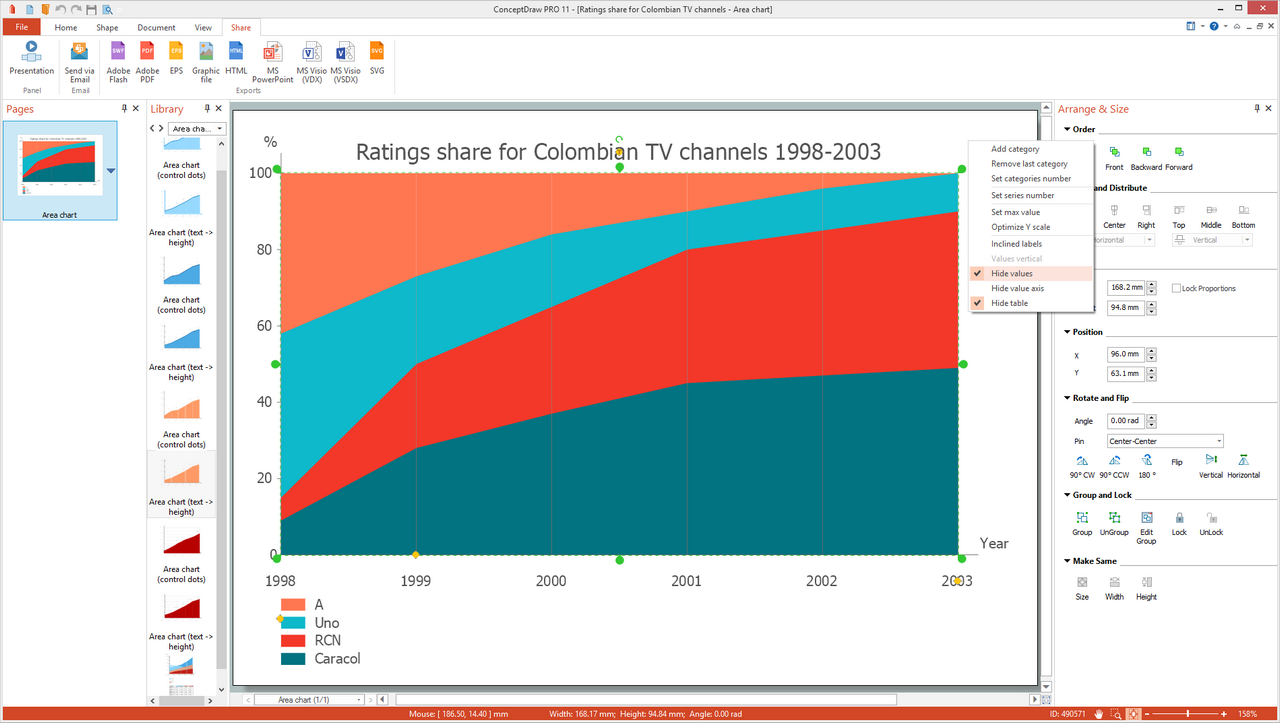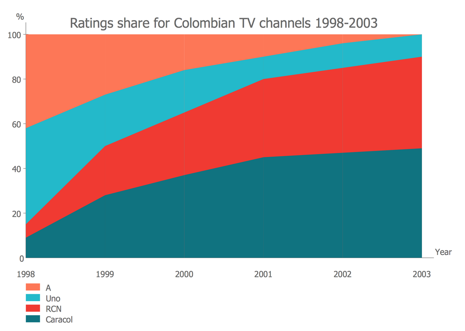 This Area Chart sample visually illustrates the ratings share for Columbian TV channels in 1998-2003 and was designed on the base of the Wikimedia Commons file "Ratings share for Colombian TV channels 1998-2003.png". Until 1998 Colombian television was a state monopoly. From 1998 exists several state-owned channels and several privately with national, regional or local coverage that broadcast different news, films, telenovelas, series, shows, etc. Four main Columbian networks are represented in this diagram, these are A, Uno, RCN, and Caracol. From year to year, the popularity of each of them changes under the influence of different factors. That's why the areas corresponding to different channels are colored uniquely in this diagram. It is convenient for the chart's perception and analysis. The chart is constructed on the base of the table with values, which is now hidden but can be shown again at any moment when the corresponding file will be opened at the application.