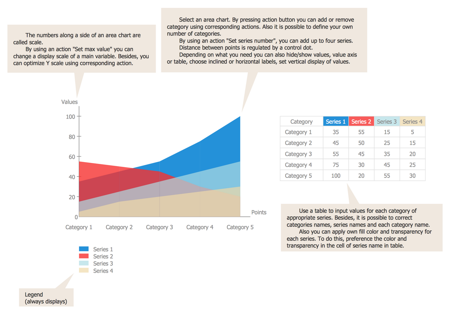 Quite often, selecting an appropriate diagram style is one of the hardest tasks of a job. To help with this selection process, ConceptDraw DIAGRAM has many templates to pick from. The templates of different types contain materials that will help you decide what to use for your specific diagramming application. This template is intended to represent several series that are visually separated by different colors, the correspondence of which is depicted at the legend. The data for each category and each series need to be entered to the table, then they are automatically depicted on the Area Chart. The table can be hidden and shown again from the object's menu if needed, as well as values and value axis can be hidden/shown. You can also add/remove the categories, set categories and series numbers, set max value, optimize Y scale, and show labels horizontally or inclined using the corresponding commands from the object's action menu.