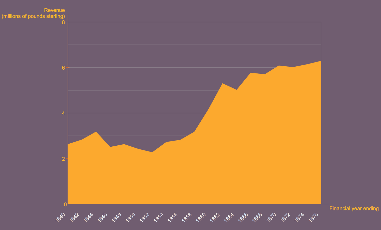The unique illustrative capability of the Area Chart is helpful to visual and clear represent how the values change over time. This Area Chart shows the revenue of the British India Salt Company in period 1840-1877 including the inland and port taxes, and sale of government salt. It is based on the Wikimedia Commons file "British India salt revenue 1840-1877.png". Until 1858 the company was named the East India Salt Company, then it became the British India company. The vertical axis shows the revenue in millions of pounds sterling and the horizontal axis depicts the financial year ending. When the corresponding revenues for each second year from 1840 to 1877 were marked in the diagram and linked in a line graph, the area under the line graph was filled with a solid color – yellow color in this case. In some cases, the area can be filled by color with texture.